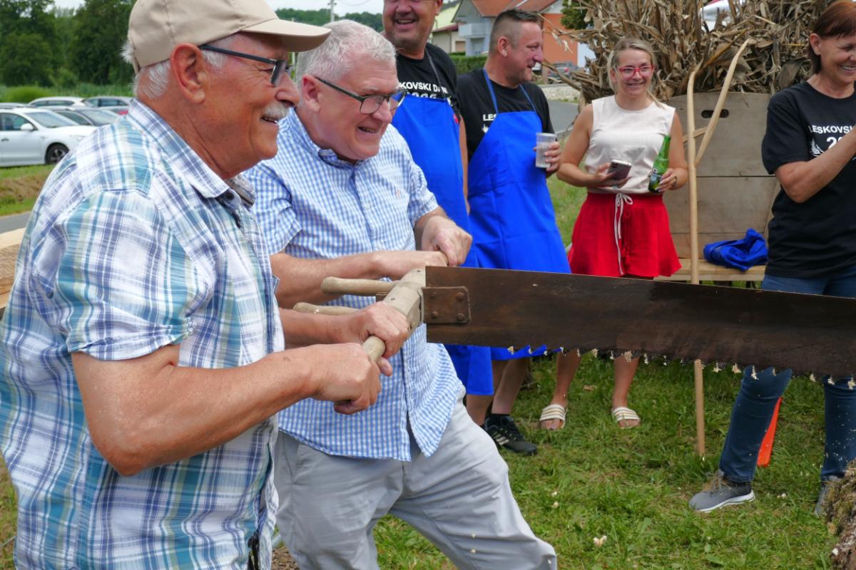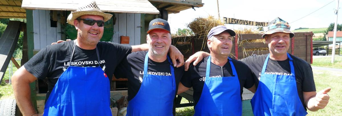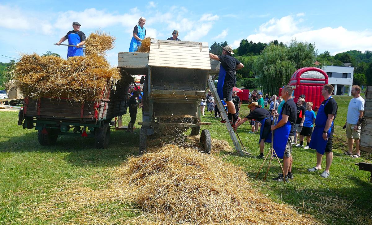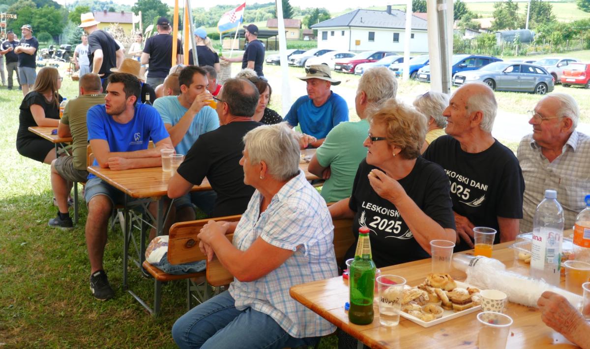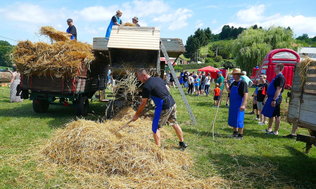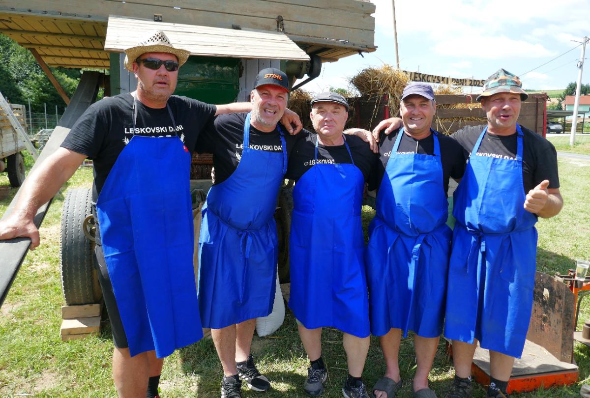 U Leskovcu, malom mjestu nedaleko Štrigove, u najljepšem bregovitom dijelu Međimurja, danas, u subotu, priređen je spektakularni Dan sela Leskovec, treći po redu. Veseli i razigrani Leskovčani, koje su predvodili četiri brata Robert, Boris, Josip i Julijan Berzak, organizirali su prave starinske žetvene običaje i pripremili izložbu starih strojeva. Postavili su “mlatilku”, koju je pokretao stari traktor pomoću dugopg remenja, a onda su snopove ječma posebno osposbljeni majstori rezali i bacali u stroj. Slama je izbacivana naprijed, a zrnje posebnim cijevima dolazilo do zadnjeg dijela “mlatilke” i polako puštano u vreće.