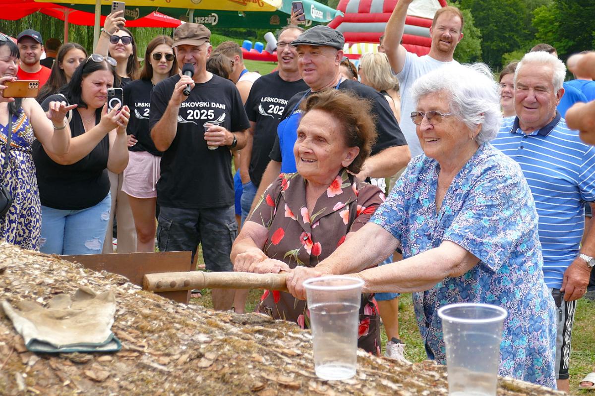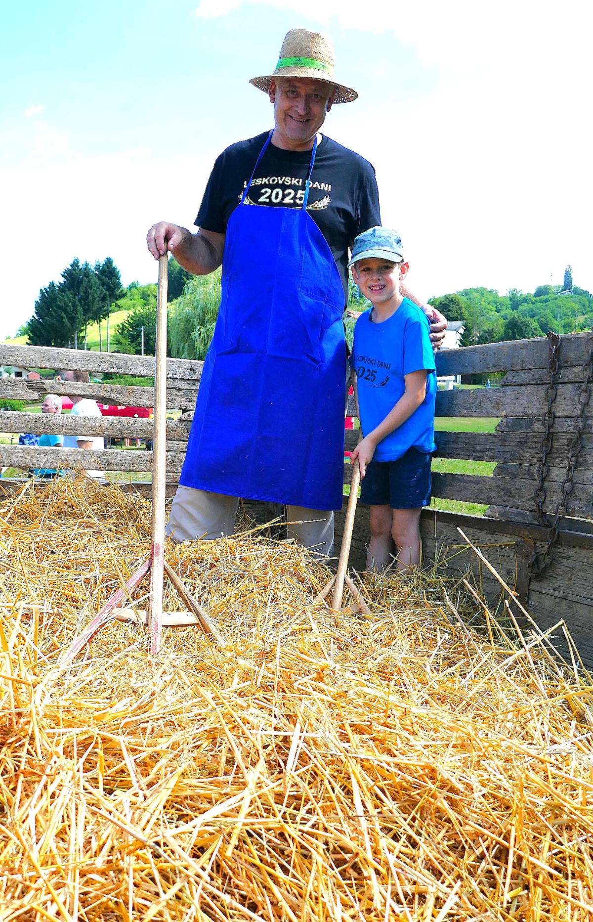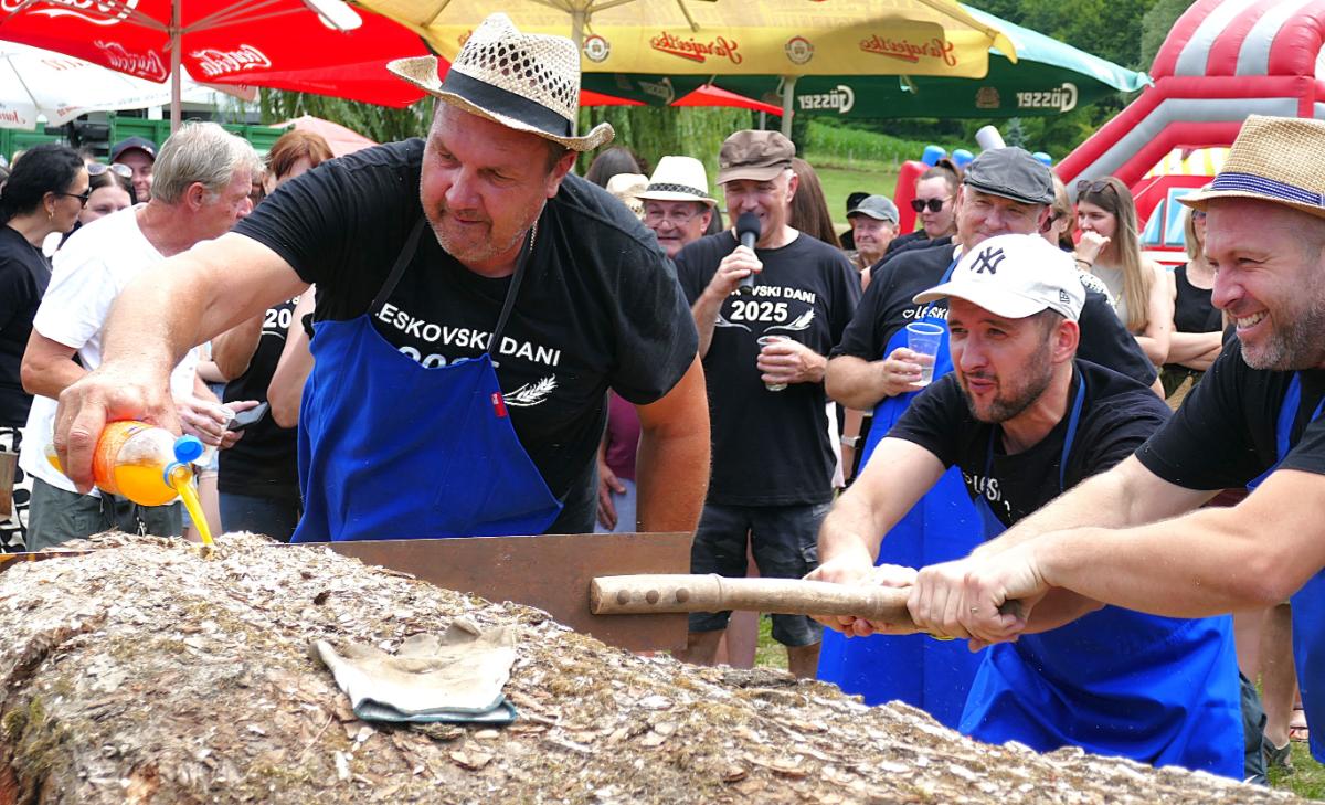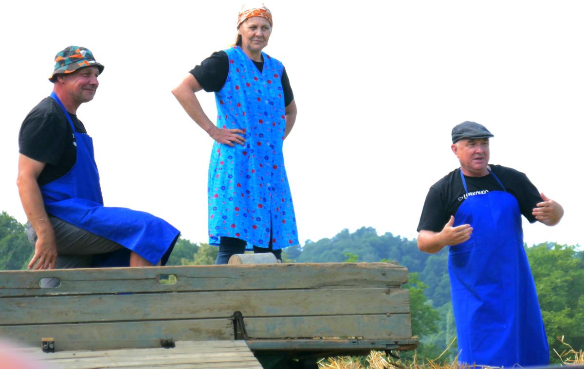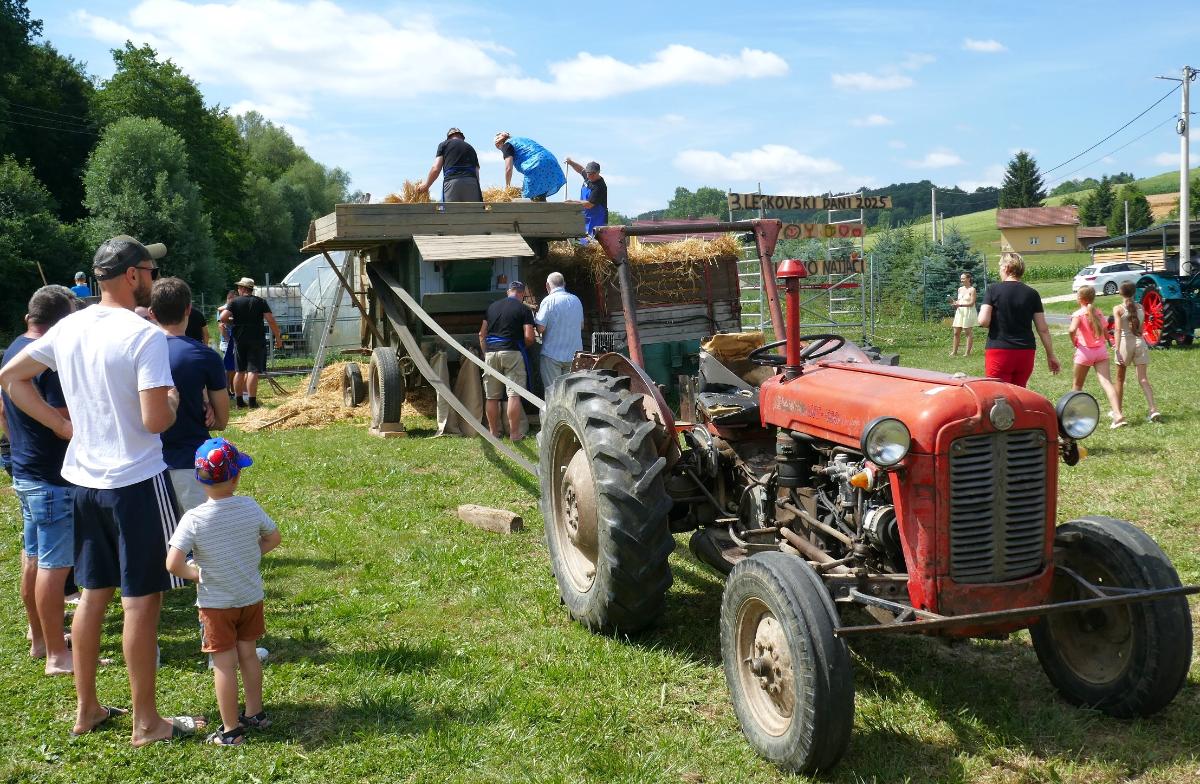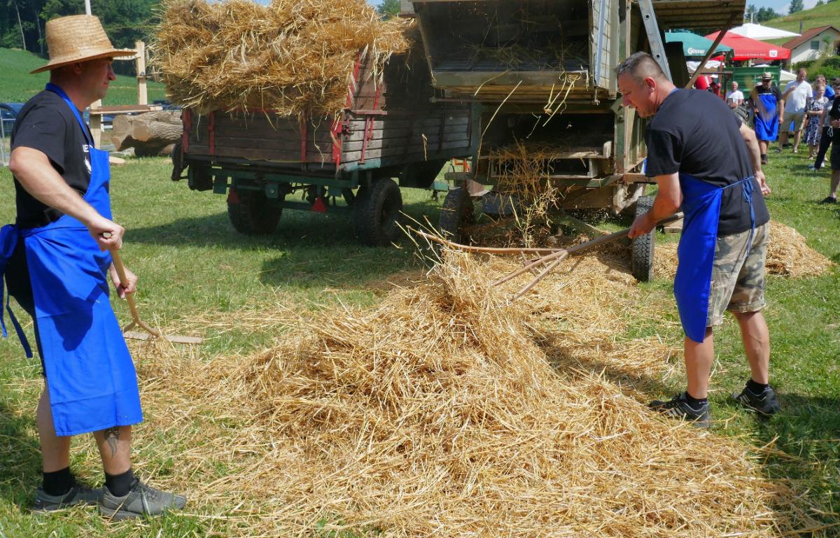 U Leskovcu, malom mjestu nedaleko Štrigove, u najljepšem bregovitom dijelu Međimurja, danas, u subotu, priređen je spektakularni Dan sela Leskovec, treći po redu. Veseli i razigrani Leskovčani, koje su predvodili četiri brata Robert, Boris, Josip i Julijan Berzak, organizirali su prave starinske žetvene običaje i pripremili izložbu starih strojeva. Postavili su “mlatilku”, koju je pokretao stari traktor pomoću dugopg remenja, a onda su snopove ječma posebno osposbljeni majstori rezali i bacali u stroj. Slama je izbacivana naprijed, a zrnje posebnim cijevima dolazilo do zadnjeg dijela “mlatilke” i polako puštano u vreće.