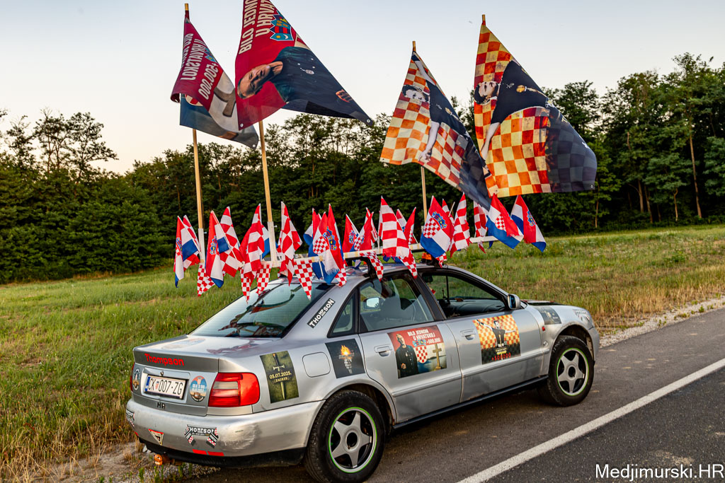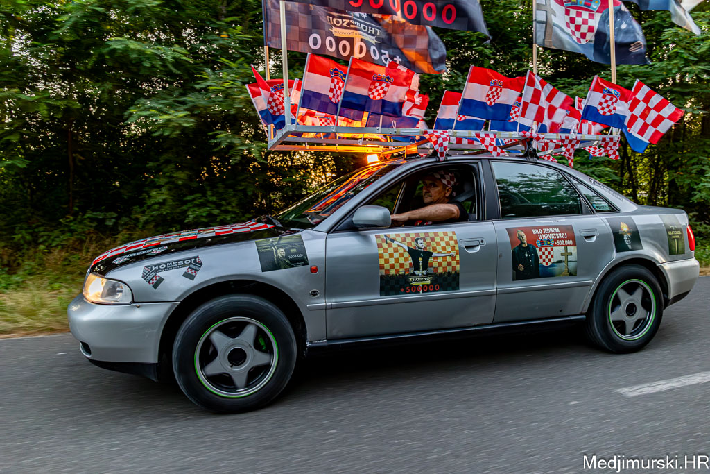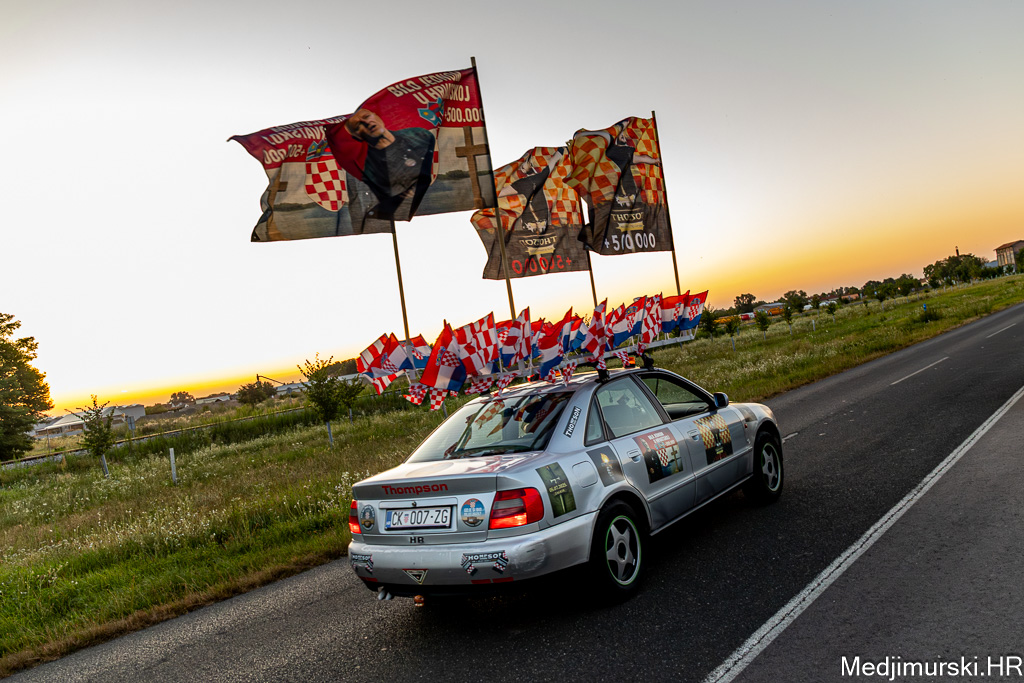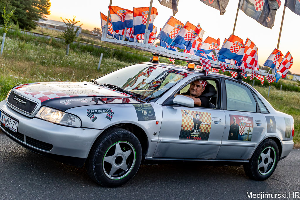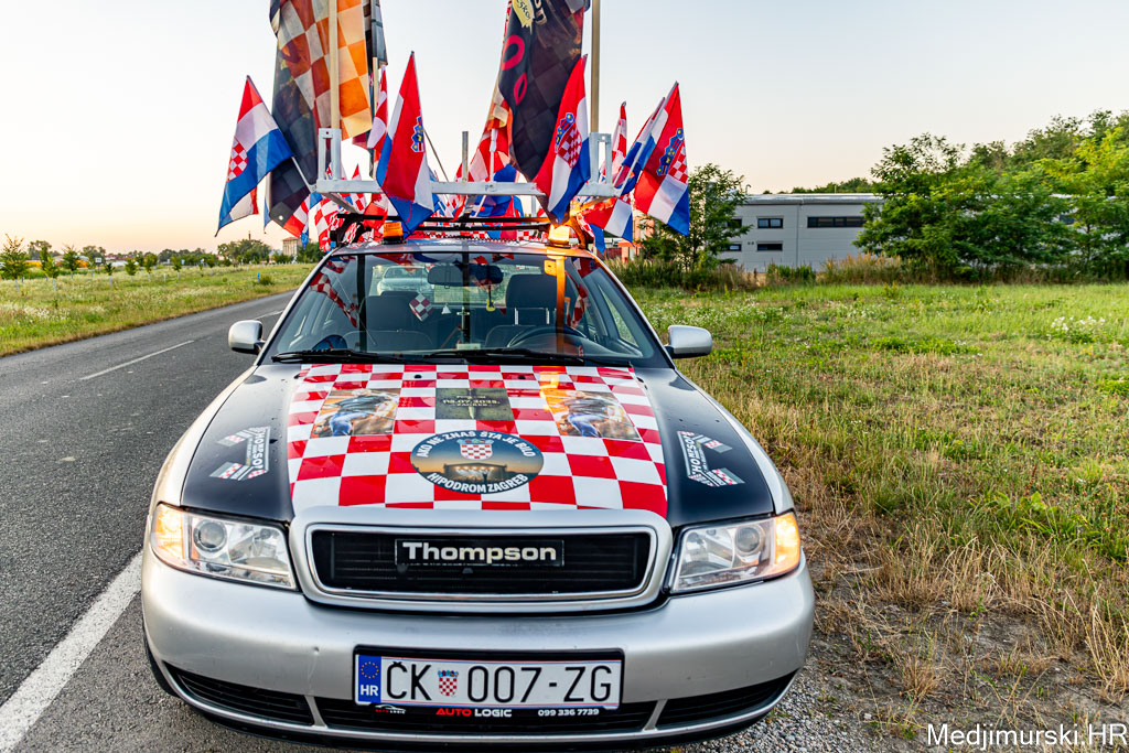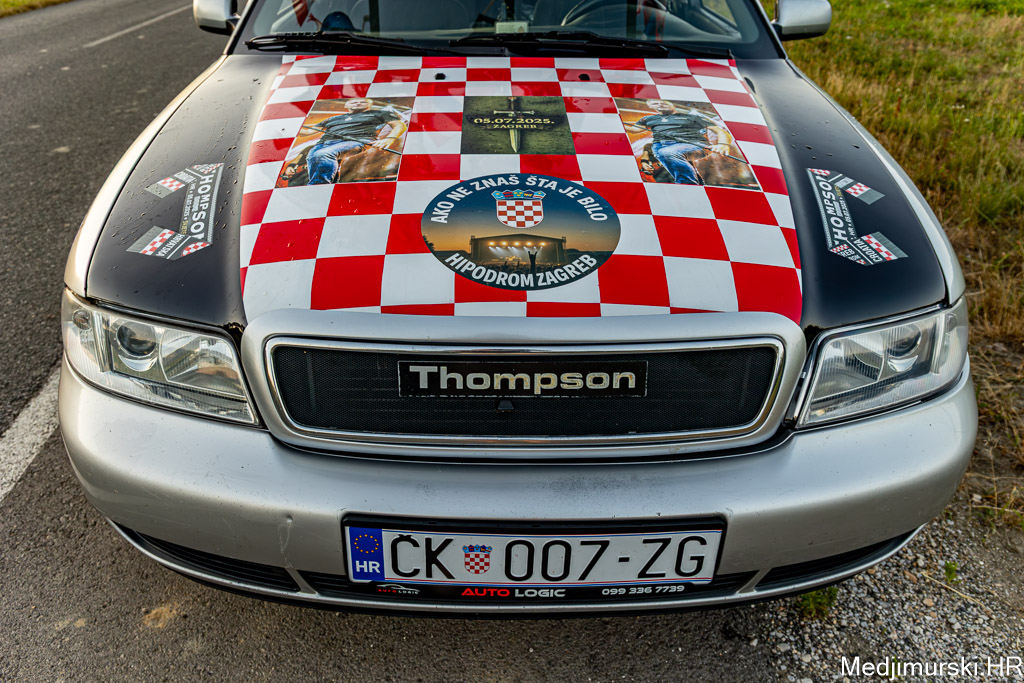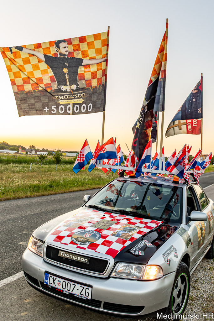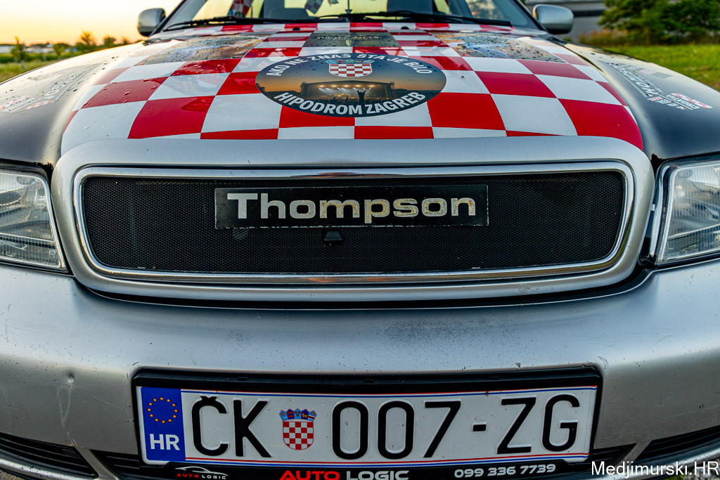 Za ovu priliku njegov, već sad i u Zagrebu, ali i u cijeloj Hrvatskoj, poznati Audi A4 ukrašen je sa 30-ak manjih hrvatskih zastavica, pričvršćenih na krov auta, 25 naljepnica te sa 4 ogromne zastave s prepoznatljivim crveno-bijelim kockicama na vrhu i slikama samog Thompsona.