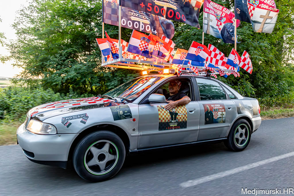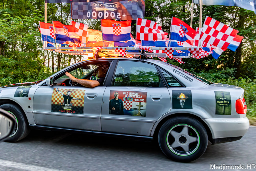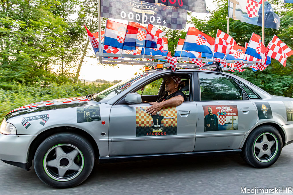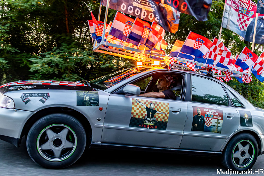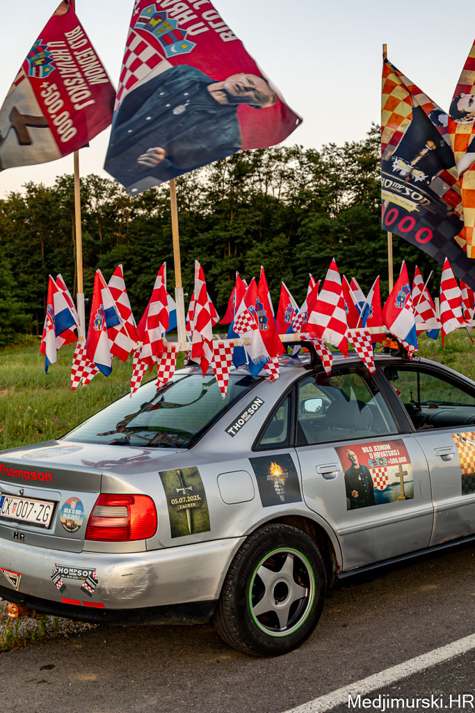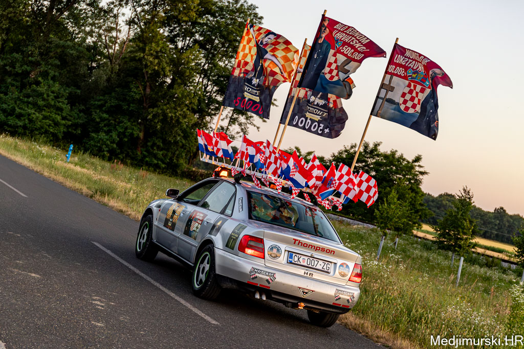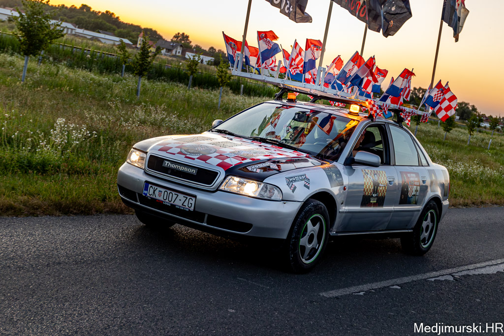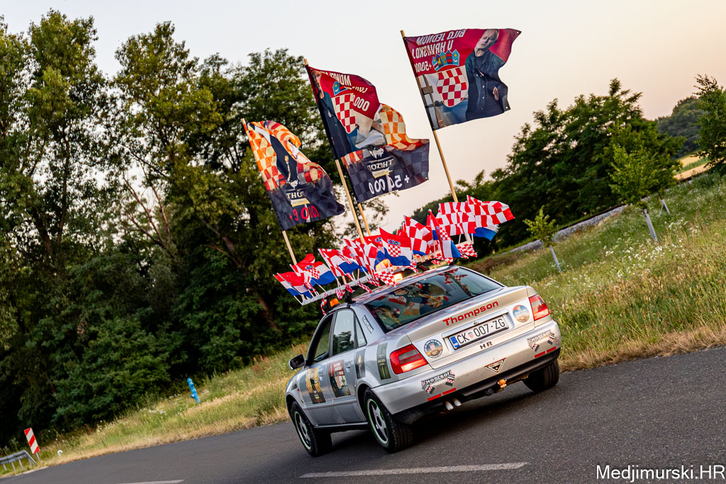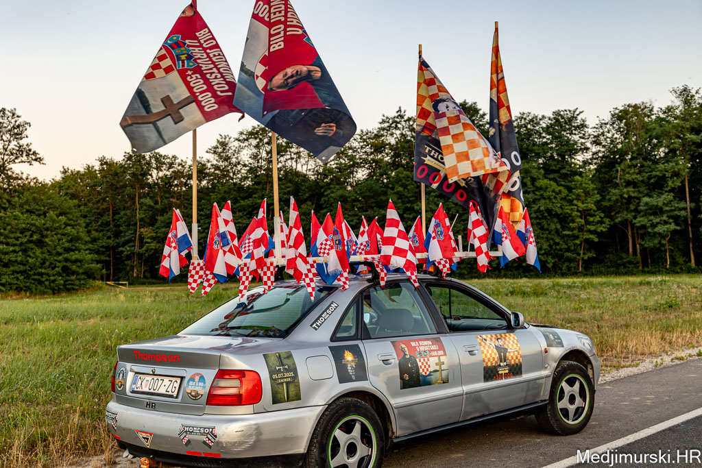 Za ovu priliku njegov, već sad i u Zagrebu, ali i u cijeloj Hrvatskoj, poznati Audi A4 ukrašen je sa 30-ak manjih hrvatskih zastavica, pričvršćenih na krov auta, 25 naljepnica te sa 4 ogromne zastave s prepoznatljivim crveno-bijelim kockicama na vrhu i slikama samog Thompsona.