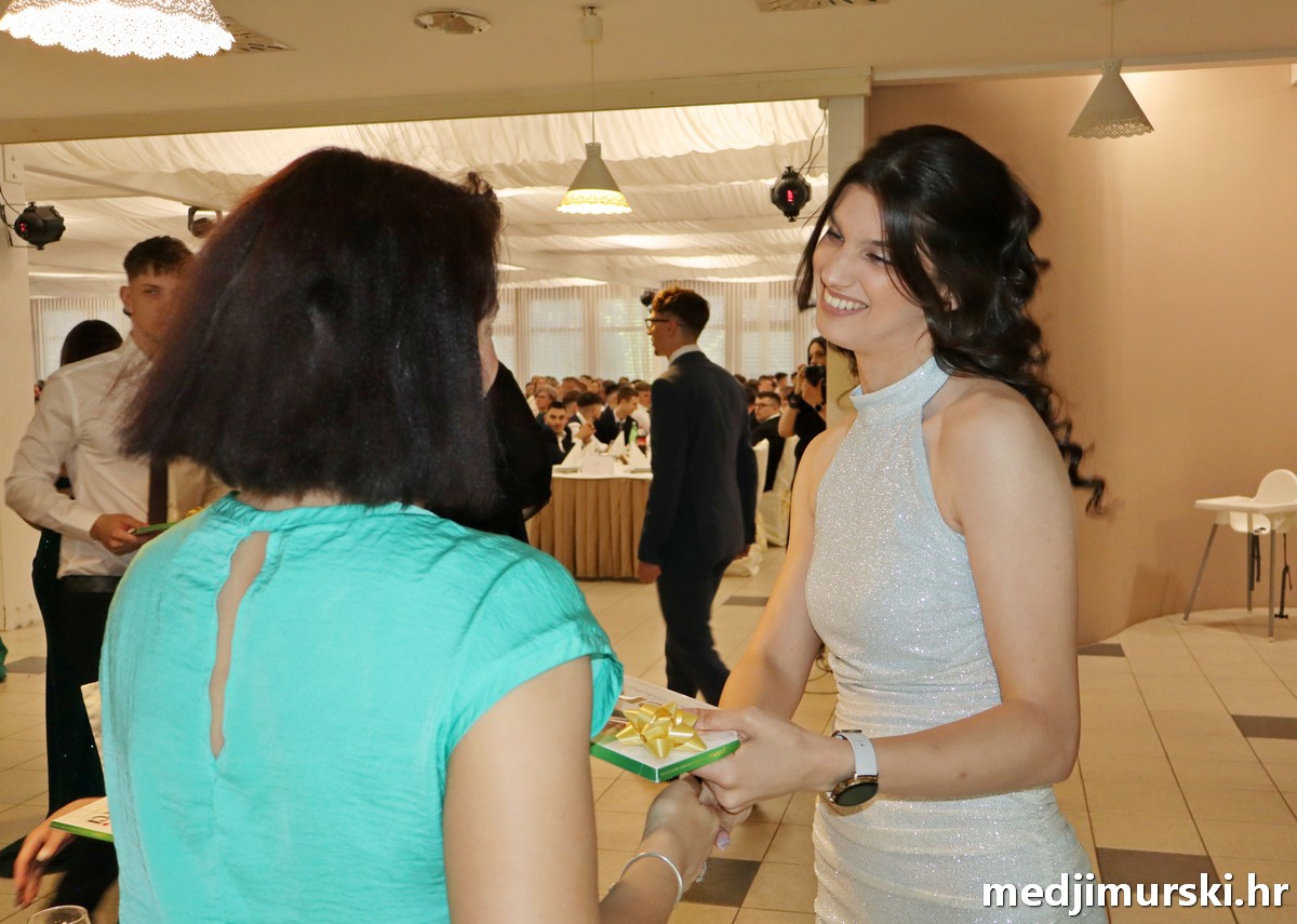 Prije svečanosti svi su se razredi fotografirali (i mi smo ih fotografirali, provjerite u fotogaleriji!), a zatim je svaki razred dočekan i predstavljen u Kristalu kao zvijezda na „crvenom tepihu“. Program svečanosti vodili su maturanti Roko Dunjko i Marta Vinko, a maturanti su svojim razrednicima: Mariju Pincu (4. ET), Anici Antolek Hrgar (4. GM), Sandri Štampar (4. MT), Nataši Lončarić (4. RT) i Silviju Štefancu (4. ST) uručili poklone, a svim profesorima i ravnatelju Draženu Blažeki čokolade za zahvalu.