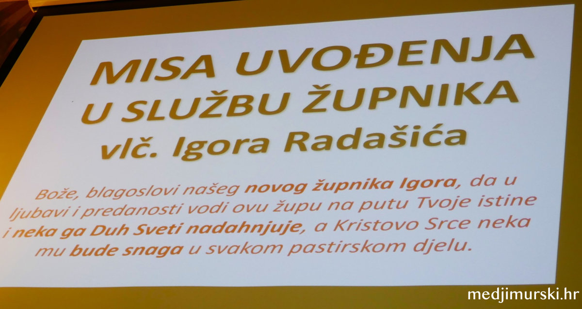 Predstavnici brojnih udruga i pastorala potom su vlč. Radašiću predali prigodne poklone i poželjeli mu dobrodošlicu u ovaj lijepi dio Međimurja uz poruku: “Bože, blagoslovi našeg novog župnika Igora, da u ljubavi i predanosti vodi ovu župu na putu Tvoje istine i neka ga Duh sveti nadahnjuje, Kristovo Srce neka mu bude snaga u svakom pastirskom djelu!”