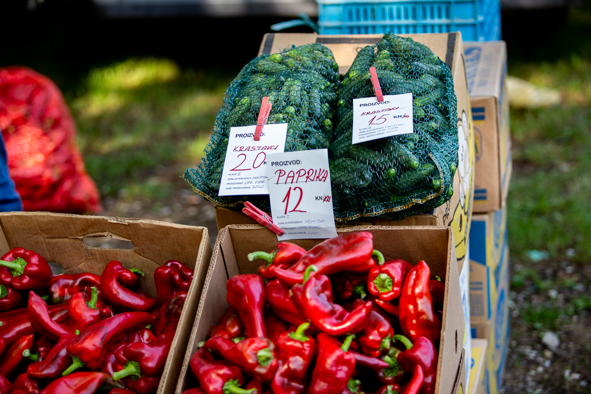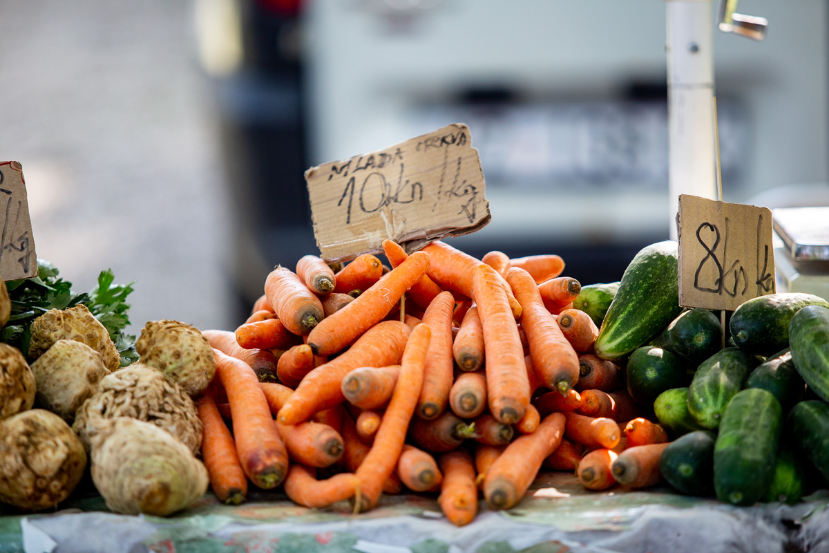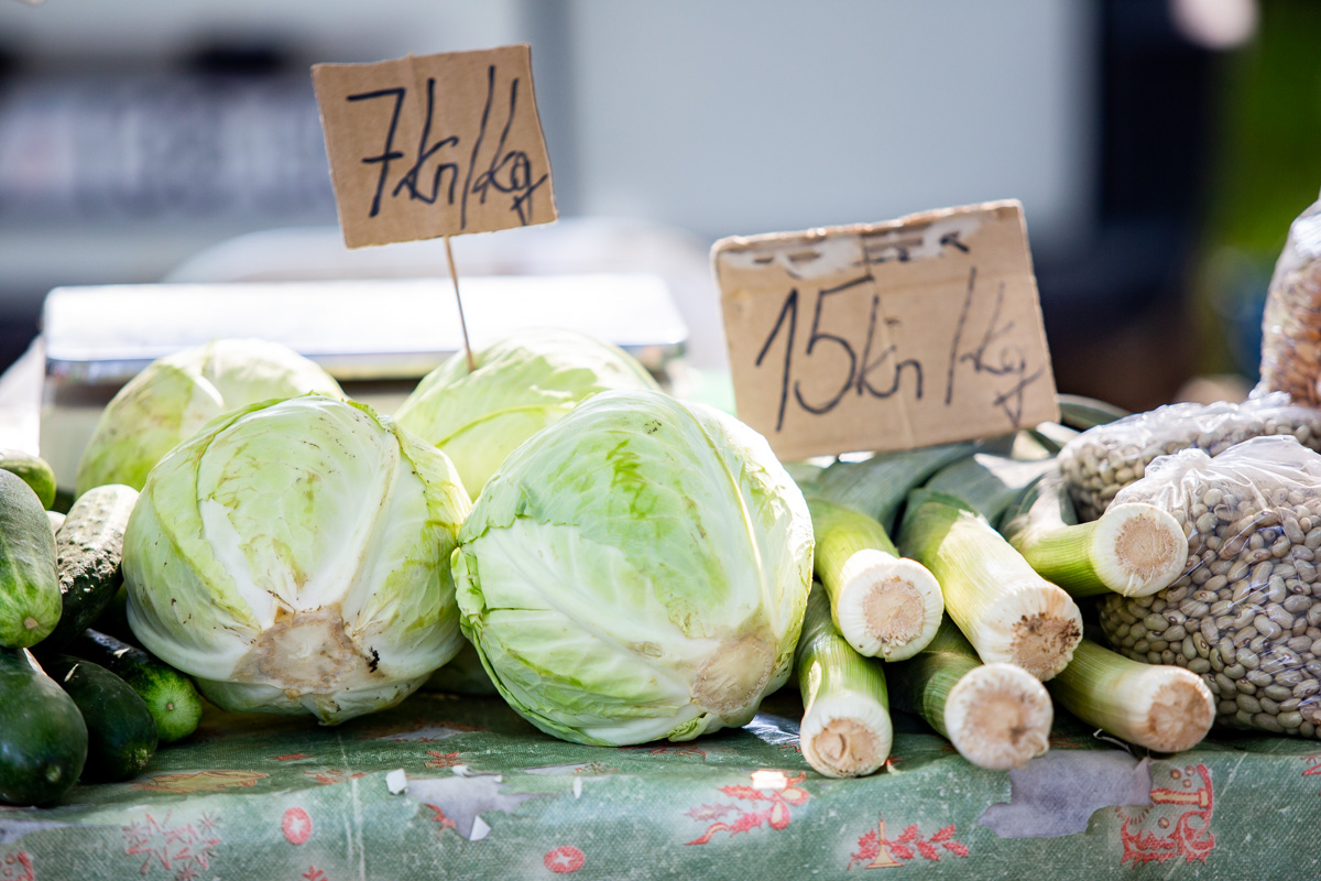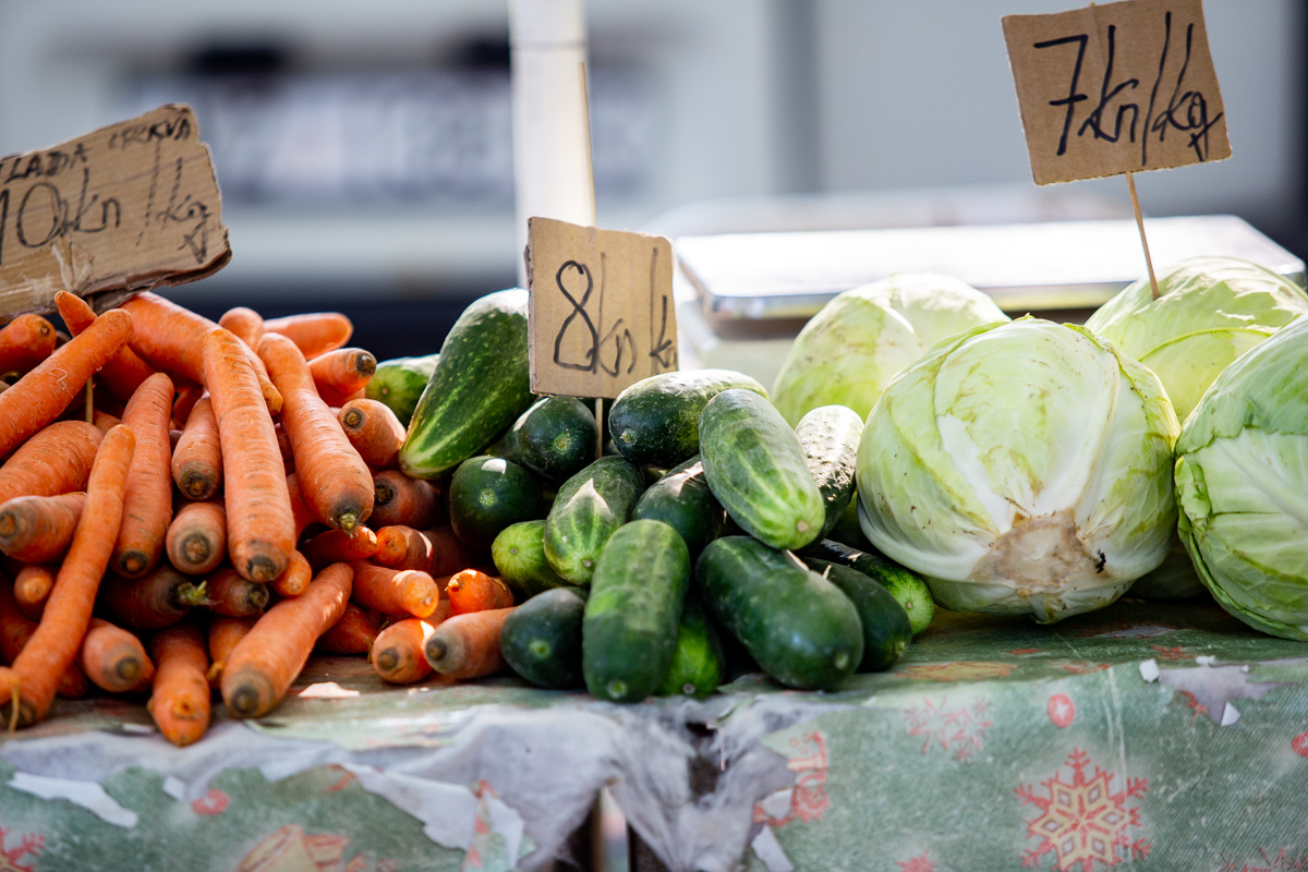 Krastavci, ovisno o veličini, nudili su se od 5 do 20 kuna kilogram. Grah čvrsto drži cijenu: onaj u ljusci prodavao se po 18 kuna kilogram, a onaj očišćeni po 50 kuna kg.