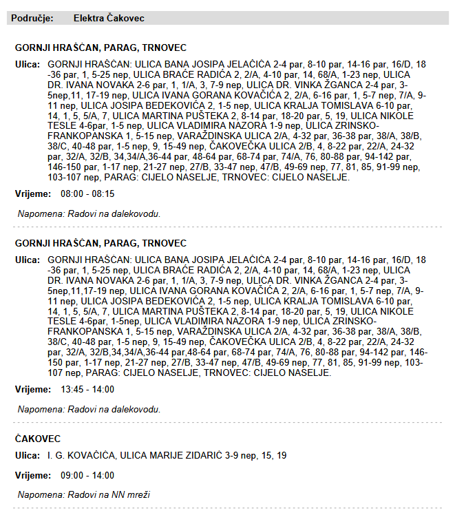 BUDITE SPREMNI Gornji Hrašćan, Parag i Trnovec će u utorak biti bez struje! Evo koji kućni brojevi Autor: HEP Foto/Video: Ilustracija 01.02.2026 08:18 - Advertisement - Iz čakovečkog HEP-a stigla je vijest, kako zbog radova na NN mreži, u utorak, 03. veljače, neće biti struje u sljedećim mjestima: - Oglas - Podijeli: FacebookWhatsAppViberEmailPrint Najnovije VREMENSKA PROGNOZA Bez stabilizacije vremena: kiša učestala i u kopnenim krajevima TERENSKA NASTAVA FOTO Učenici Osnovne škole Kuršanec posjetili memorijalne i kulturne znamenitosti Vukovara VELIKI JUBILEJ FOTO Hlapičina obilježila 100 godina školstva uz bogat program i emocije SLIJEDI BORBA ZA BRONCU Luda utakmica u Stožicama pripala Španjolcima, Hrvatska nakon totalne drame u završnici ipak ostala bez finala IMALA TIJELO PUNO METAKA, A SRCE PUNO LJUBAVI FOTO Leah, kujica s teškom prošlošću, dobila obitelj kakvu je zaslužila Pročitajte još VREMENSKA PROGNOZA Bez stabilizacije vremena: kiša učestala i u kopnenim krajevima Anita Blažunaj - Pretežno je oblačno diljem Hrvatske, kiše i pljuskova ima... IMALA TIJELO PUNO METAKA, A SRCE PUNO LJUBAVI FOTO Leah, kujica s teškom prošlošću, dobila obitelj kakvu je zaslužila medjimurski.hr - Azil Prijatelji Čakovec podijelio je dirljivu priču o kujici... DVA KUD-A, JEDNA PRIČA Ne propustite koncert ‘Korak po korak, ruku pod ruku’ u nedjelju, 8. veljače, u Belici! Hana Batcha Frančić - Nakon što je ispunio večer prekrasnom pjesmom, plesom i... U NEDJELJU U ETNO KUĆI NA ŠUDERICI Dođite na ‘Dan crvenih haljina’ u Goričan: Korisno predavanje o prvoj pomoći! Hana Batcha Frančić - U organizaciji Udruge sportske rekreacije „Sport za sve“ Goričan... Load more