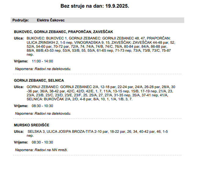 Iz Elektre Čakovec javljaju da električne energije 19. rujna neće biti u Bukovcu, Gornjem Zebancu, Praporčanu, Zaveščaku, Selnici i Murskom Središću.
