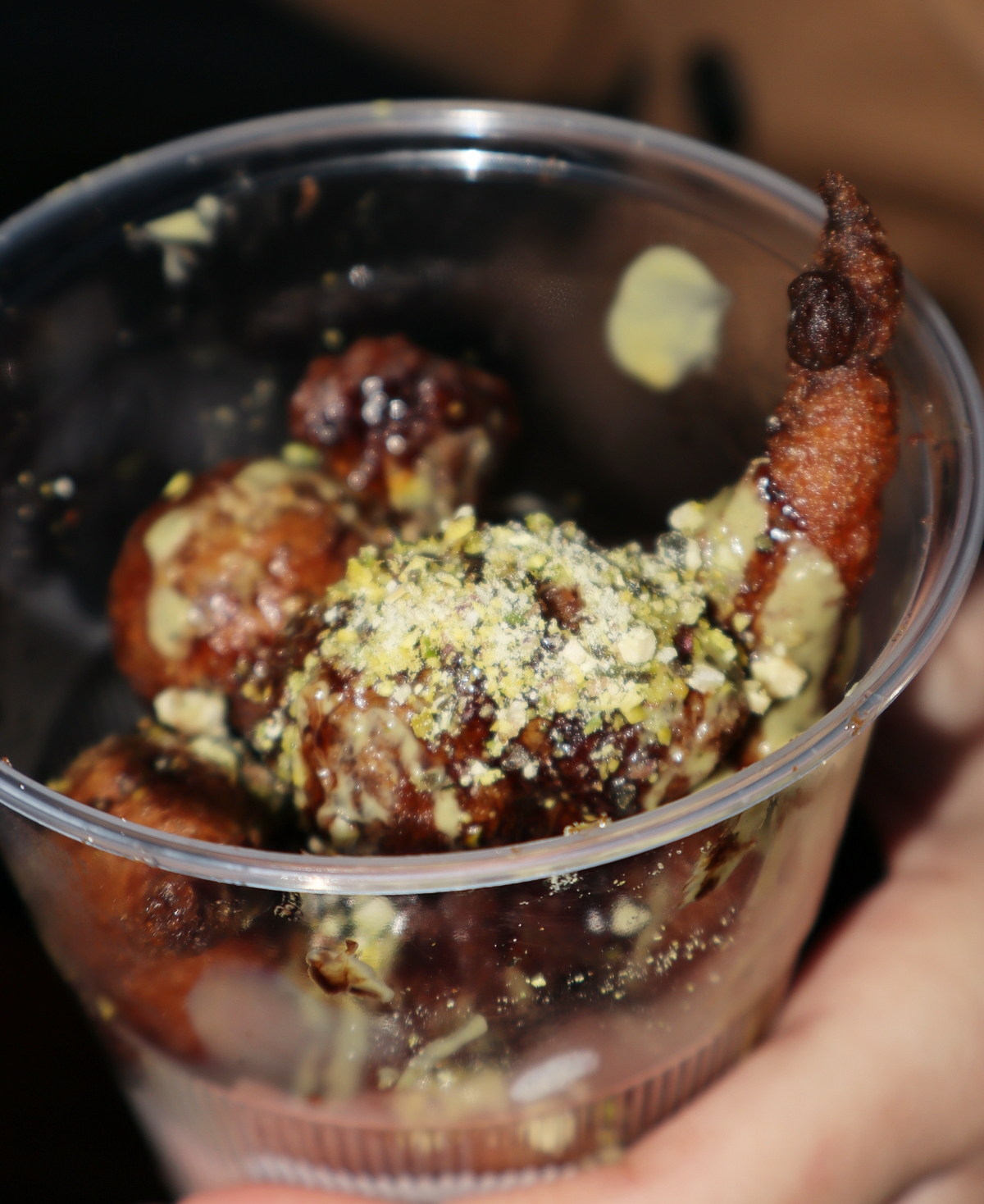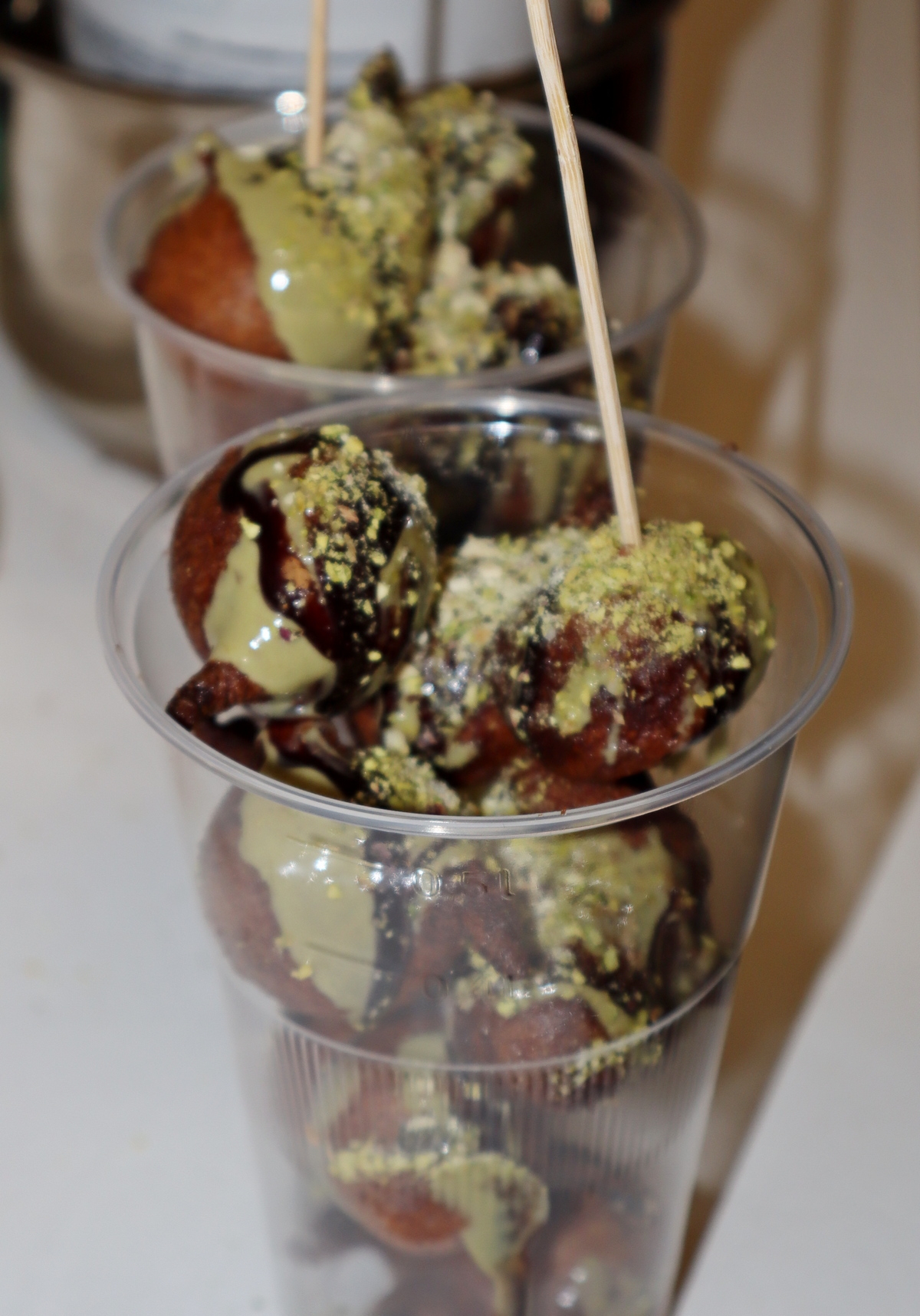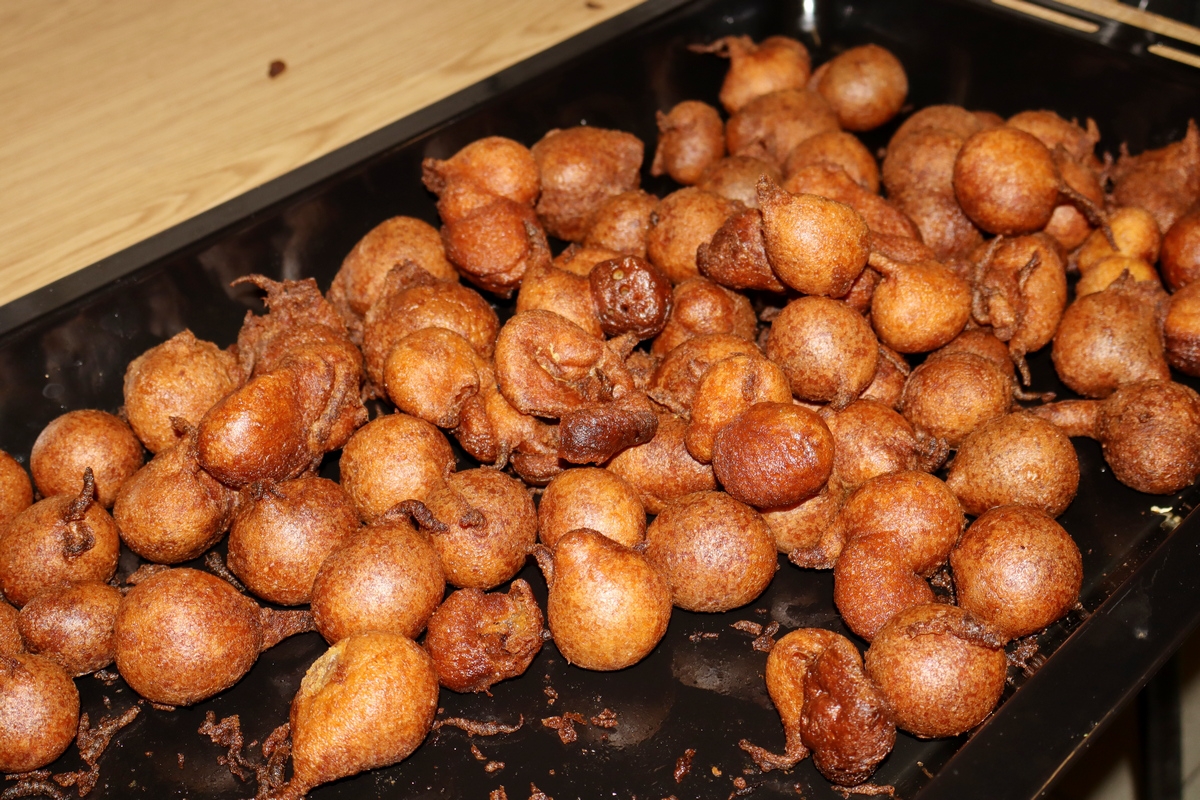 Zatim se žlicom stavljaju kuglice u puno vrućeg ulja i kratko prže, po tri minute sa svake strane. Na pečene, slasne fritule stavite preljev – na pari otopljenju crnu i bijelu (kuhinjsku) čokoladu – i posipajte ih sjeckanom ili samljevenom u blenderu prženom, ali neslanom pistacijom.