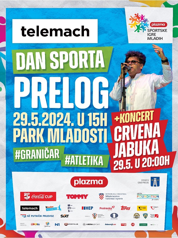 Svečani program otvaranja Telemach Dana sporta u Prelogu počinje u 15 sati, a na sportsko-edukativnom danu, u sklopu Plazma Sportskih igara mladih i uz podršku Grada Preloga, sudjelovat će brojna djeca osnovnoškolskog uzrasta koja će se natjecati u graničaru i atletici. Najbolje ekipe i atletičari izborit će plasman na državnu završnicu Telemach Dana sporta koja će se održati krajem srpnja u Rijeci. Ovaj zabavno-sportski dan u Prelogu nastavit će se bogatim glazbenim programom, velikim vatrometom te poklon koncertom Crvene jabuke u 20 sati.