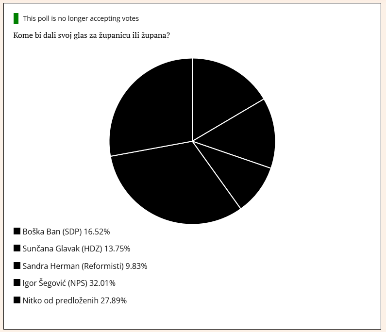 Prije dva dana krenuli smo s anketom o tome kome bi dali glas za međimurskog župana da su danas izbori. Glasati ste mogli samo jednom i samo za jednog od predloženih četiri moguća kandidata: 1.Bošku Ban (SDP); 2.Sunčanu Glavak (HDZ); 3. Sandru Herman (Reformisti); 4. Igora Šegović(NPS); i 5. Nikoga od predloženih.