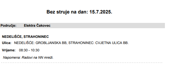 Iz HEP-a obavještavaju građane da utorak, 15. srpnja, neće biti električne energije na području Nedelišća i Strahoninca, i to u vremenu od 8:30 do 10:30 sati, zbog radova na niskonaponskoj mreži (NN mreži).