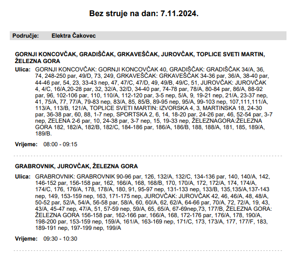 Iz HEP-a javljaju kako će u četvrtak, 7. studenog bez struje ostati nekoliko naselja.