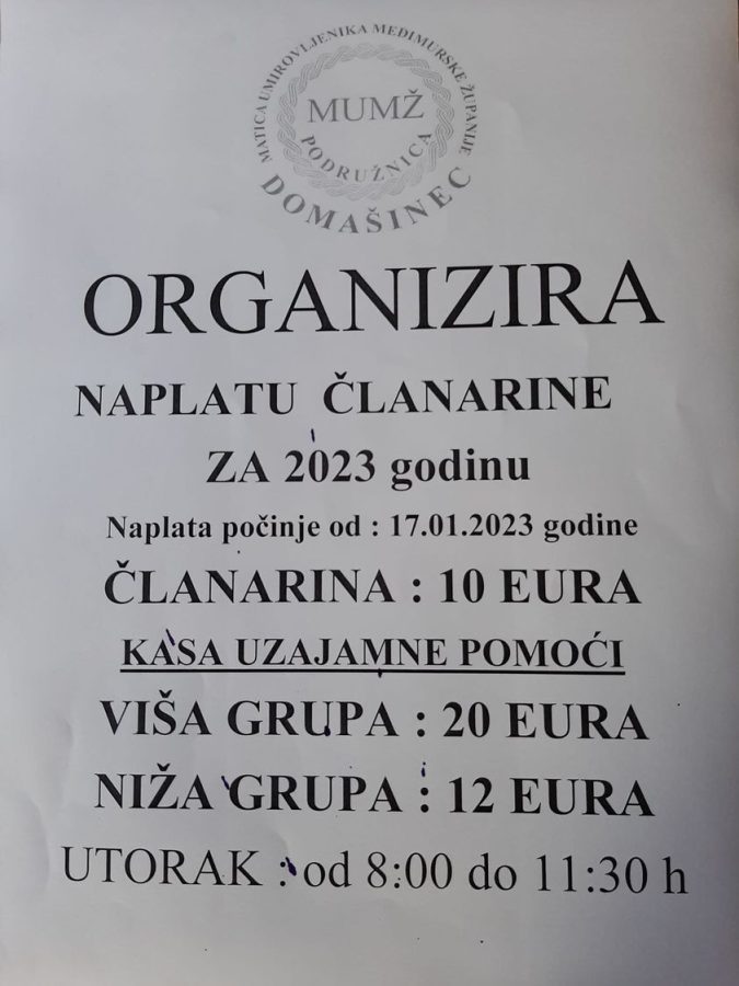 ”Pozivamo staro članstvo na obnovu članstva u 2023 godini.Tako isto pozivamo sve umirovljenike koji do sada nisu bili naši članovi da se nam dragovoljno priključe u članstvo kako bi i ove 2023 godine mogli zajedno sudjelovati u ovogodišnjim Manifestacijama i programima od značaja za našu zajednicu.  Pozivamo sve umirovljenike na dragovoljno učlanjenje u Podružnicu kako bi mogli koristiti sve „benifite” koji omogućuje svim učlanjenim  mnogobrojne popuste i povlastice koje proizlaze iz članstva.”