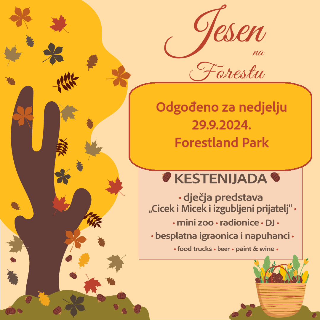Zbog jutarnje kiše, planovi za kestenijadu, druženje i predstavu u sklopu manifestacije Jesen na Forestu premješteni su s subote na nedjelju, 29. rujna.