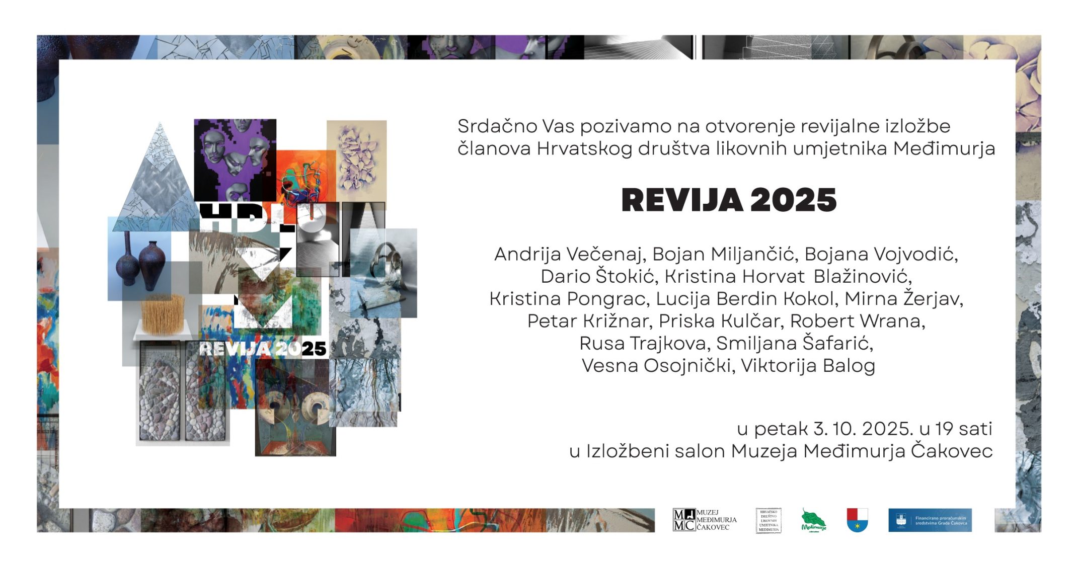 Izložbeni salon Muzeja Međimurja Čakovec ima izuzetnu čast biti domaćinom Revijalne izložbe članova Hrvatskoga društva likovnih umjetnika Međimurja. Povod izložbi je predstavljanje recentnih radova domaćoj publici u najvećoj statusnoj galeriji u matičnom Međimurju.