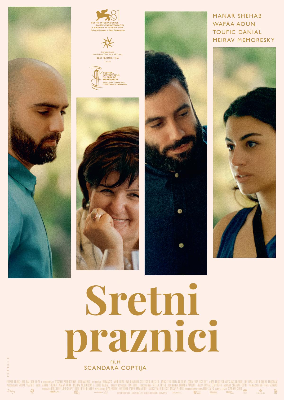 Film „Sretni praznici“, nagrađen za najbolji scenarij u programu Horizonti Venecijanskog filmskog festivala, drugi je film nagrađivanog palestinskog redatelja Scandara Coptija. Svojim režijskim pristupom Copti priziva filmove Asghara Farhadija i Roberta Altmana, dok propituje kako se moć i volja države prelijevaju u ljudsku intimu, preoblikujući osobne odnose u konzervativnom društvu pod kojim trpe svi, a najviše žene.