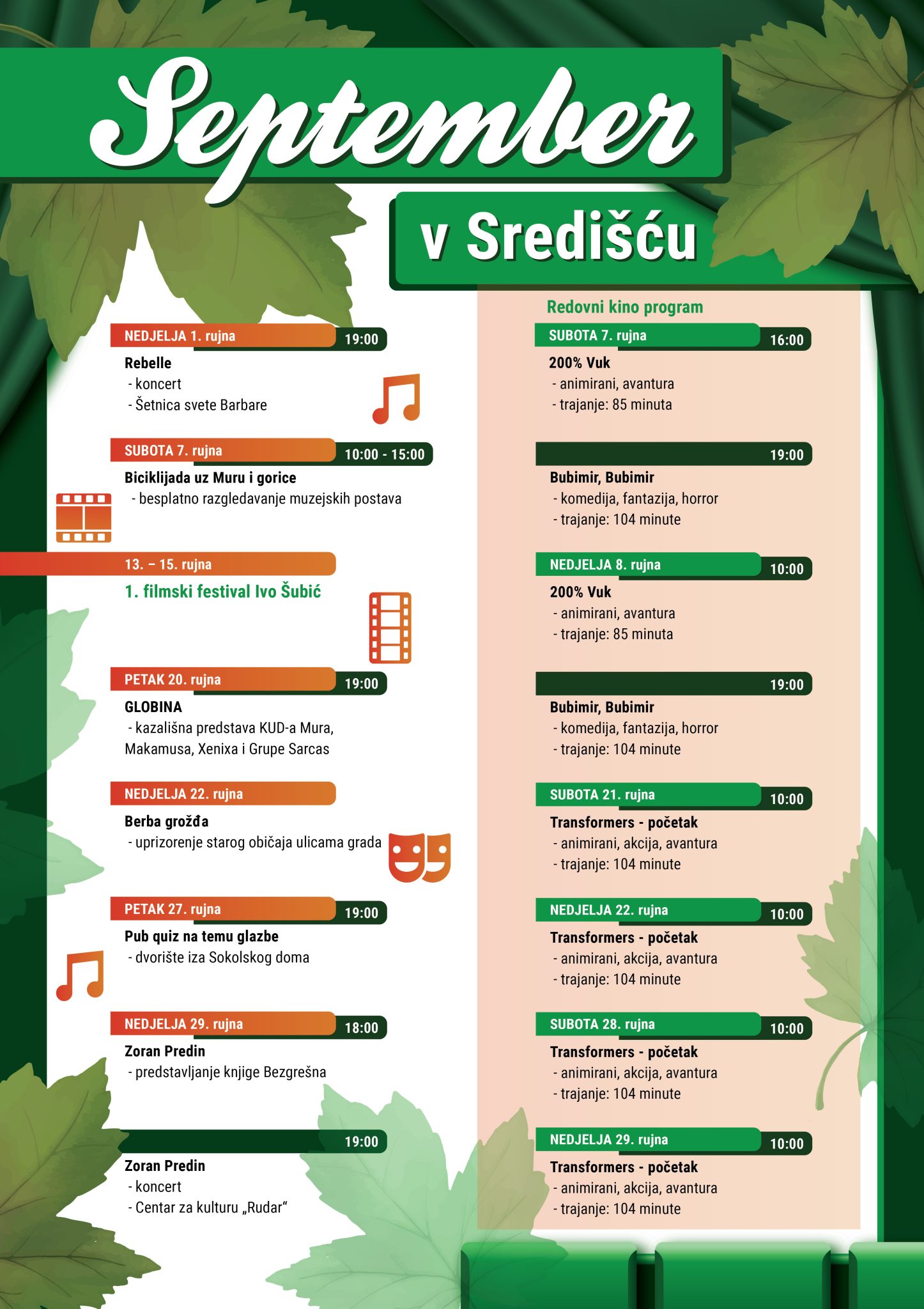 Festival će se održati na Ljetnom kinu iza Sokolskog doma. Moći ćete doživjeti i oživljeni događaj iz središćanske prošlosti, Berbu grožđa, kao i biciklijadu koja nudi besplatan ulaz u interpretacijske centre i etno kuće naše Turistička zajednica područja “Mura i gorice”.