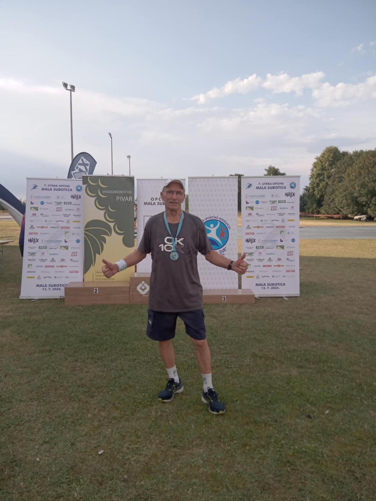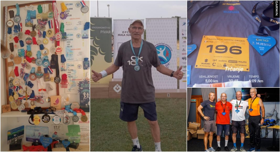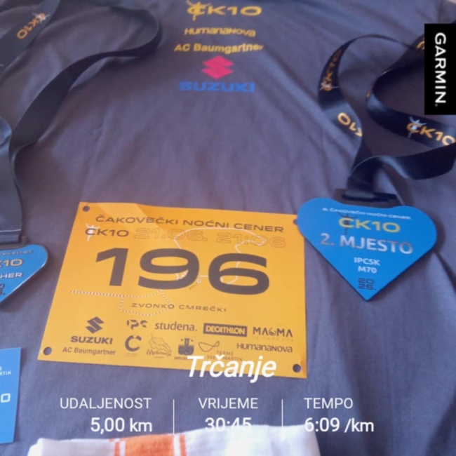 Vratimo se subotnjoj utrci, Šestom čakovečkom noćnom ceneru – ČK10, gdje je među 1000 i više natjecatelja nastupio u kategoriji 70+, a taj plus mu je devet godina koje su ga svrstale u red najstarijih natjecatelja. Osvojio je vrlo dobro drugo mjesto, istrčavši stazu od 5 kilometara za 0:30:45.