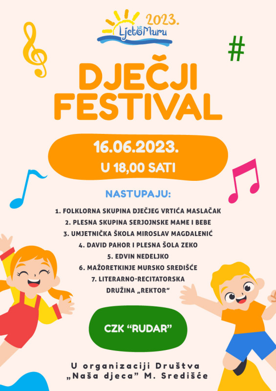 U petak 16. lipnja počinje tradicionalna kulturno zabavna manifestacija Ljeto uz Muru. U Centru za kulturu “Rudar” s početkom u 18,00 sati u organizaciji Društva “Naša djeca” Mursko Središće održat će se drugi Ljetni dječji festival, na kojem će djeca i mladi prezentirati svoje umijeće.