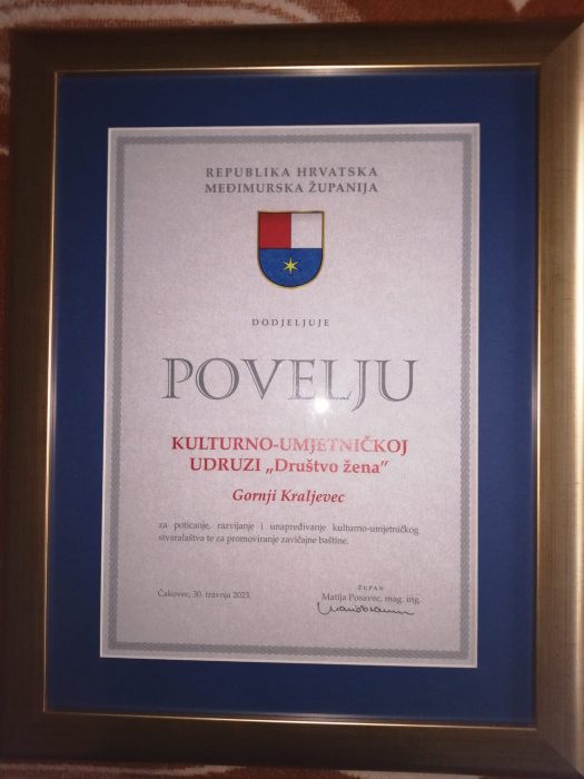 Članice KUU „Društvo žena Gornji Kraljevec” nagrađene su POVELJA MEĐIMURSKE ŽUPANIJE, za poticanje, razvijanje i unapređivanje kulturno-umjetničkog stvaralaštva te promoviranje zavičajne baštine. Bilo je to jučer na Svečanoj sjednici Skupštine MŽ.