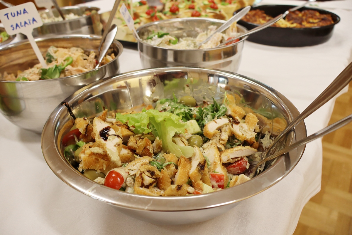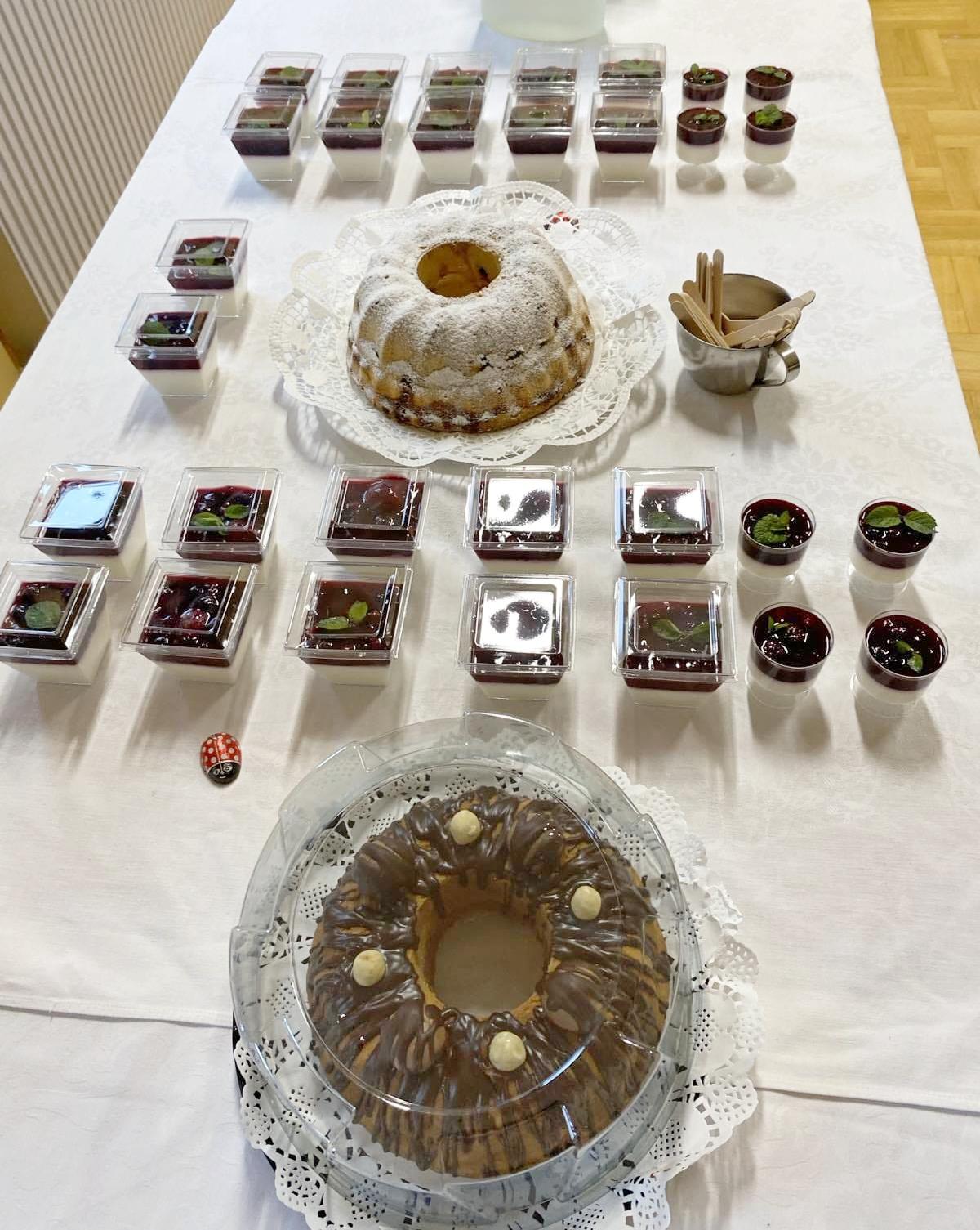Martina je tada pripremila božanstvene salate: ječmenu salatu s feta sirom, Cezar salatu (salatu s pohanom piletinom), salatu sa šunkom i sirom te tuna salatu, zatim raznorazne kanapee te, uvijek razmišljajući i o vegetarijancima – vege tortilje s prosenom kašom, mrkvom, sirom, matovilcem i sjemenkama sezama. I ne samo to – uspjela je za ovu prigodu pripremiti i deserte, pana cotu u čašicama, domaći kuglof s višnjama te posebnu tortu od rogača, naranče i datulje, bez šećera, s medom!