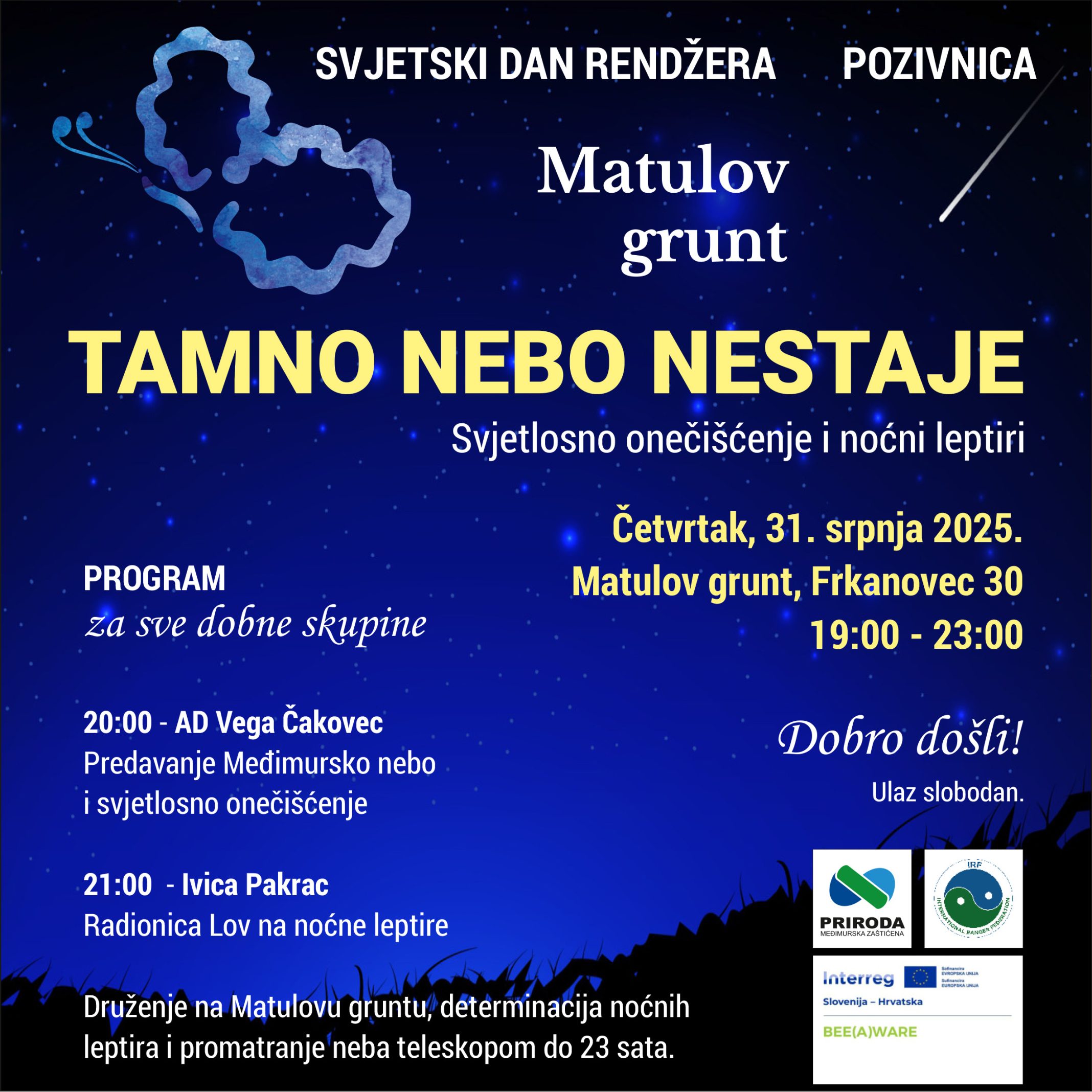 Događanje će se održati u četvrtak 31. srpnja 2025. godine na Matulovu gruntu u Frkanovcu, s početkom u 19 sati, a fokus će biti na svjetlosnom onečišćenju i noćnim leptirima.
