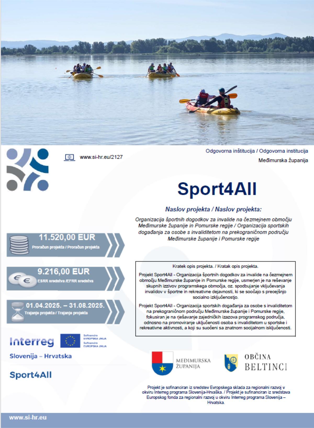 Projekt „Organizacija sportskih događaja za osobe s invaliditetom na prekograničnom području Međimurske županije i Pomurske regije“, akronima „Sport4All“, fokusiran je na promoviranje uključenosti osoba s invaliditetom u sportske i rekreativne aktivnosti, a od 1. travnja 2025. do 31. kolovoza 2025. provodit će se na području Međimurske županije i Općine Beltinci, u okviru programa prekogranične suradnje Interreg Slovenija – Hrvatska.