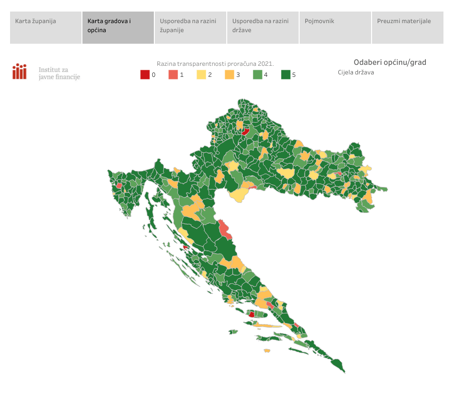 Prosječna proračunska transparentnost – mjerena brojem proračunskih dokumenata objavljenih na mrežnim stranicama županija, gradova i općina – iz godine u godinu se popravlja te u ovom ciklusu iznosi 4,5 od mogućih 5. Kako bi dobiveni rezultati bili što dostupniji i pregledniji, Institut za javne financije je objavio interaktivnu kartu koja prikazuje stanje u svim županijama, gradovima i općinama.