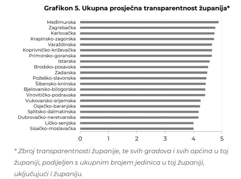Uz Međimursku županiju, najvišu razinu transparentnosti proračuna, odnosno ocjenu 5, ostvarili su gradovi Čakovec, Prelog i Mursko Središće te općine Belica, Dekanovec, Domašinec, Donja Dubrava, Donji Vidovec, Goričan, Kotoriba, Mala Subotica, Nedelišće, Orehovica, Podturen, Pribislavec, Selnica, Strahoninec, Sveta Marija, Sveti Juraj na Bregu, Sveti Martin na Muri, Šenkovec, Štrigova i Vratišinec.