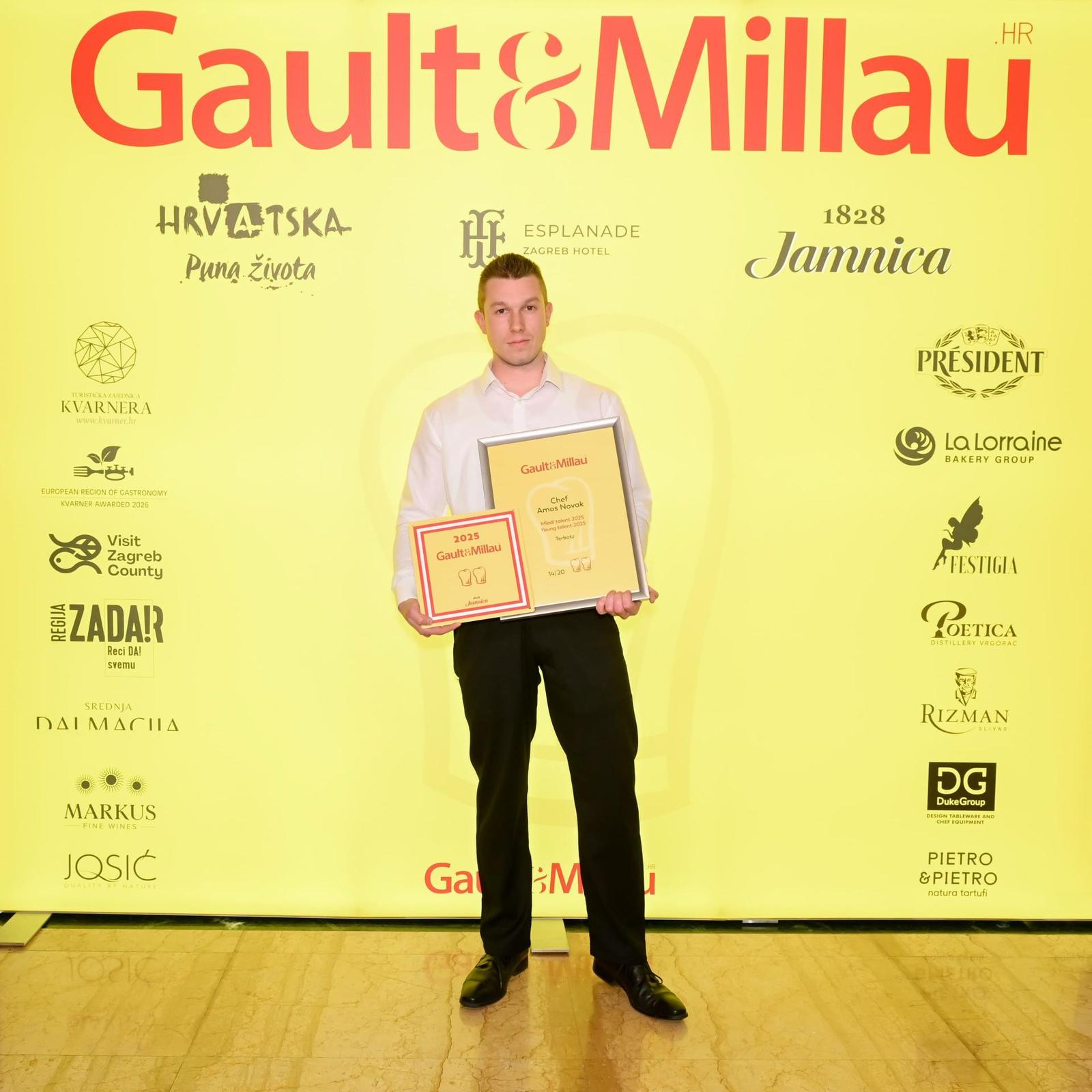 Dodjela nagrada Gault&Millau 2025. održana je u zagrebačkom Hotelu Esplanade, gdje se okupilo više od stotinu chefova iz cijele Hrvatske. Ministar turizma Tonči Glavina pri uručenju se nagrada osvrnuo posebno osvrnuo na mlade chefove poput Amosa Novaka. – Posebno me veseli ovdje vidjeti mlada lica jer pokazuju kako imamo novu generaciju talentiranih ljudi koji donose svježinu i inovacije u našu industriju.