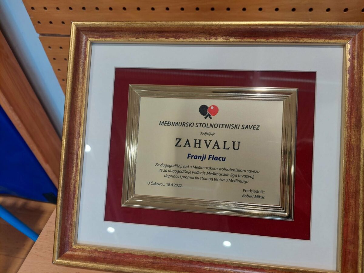 Na uskrsni ponedjeljak održano je pojedinačno Prvenstvo Međimurja u stolnom tenisu, te je Međimurski stolnoteniski savez uručio posebno priznanje i zahvalu Franji Flacu za dugogodišnji rad u promicanju stolnog tenisa u Međimurju, vođenje liga, postignute rezultate i rad, promociju i razvoj stolnog tenisa, klubova i saveza, objavio je na svojoj službenoj Facebook stranici župan Matija Posavec.