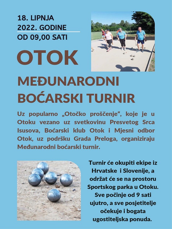 Turnir će okupiti ekipe iz Hrvatske i Slovenije, a održat će se na prostoru Sportskog parka u Otoku. Prije nekoliko godina na tom je prostoru uređeno boćalište, a zaljubljenici u ovaj sport obećaju pravi sportski spektakl, uz brojne majstore ove sportske discipline. Sve počinje od 9 sati ujutro, a sve posjetitelje očekuje i bogata ugostiteljska ponuda.