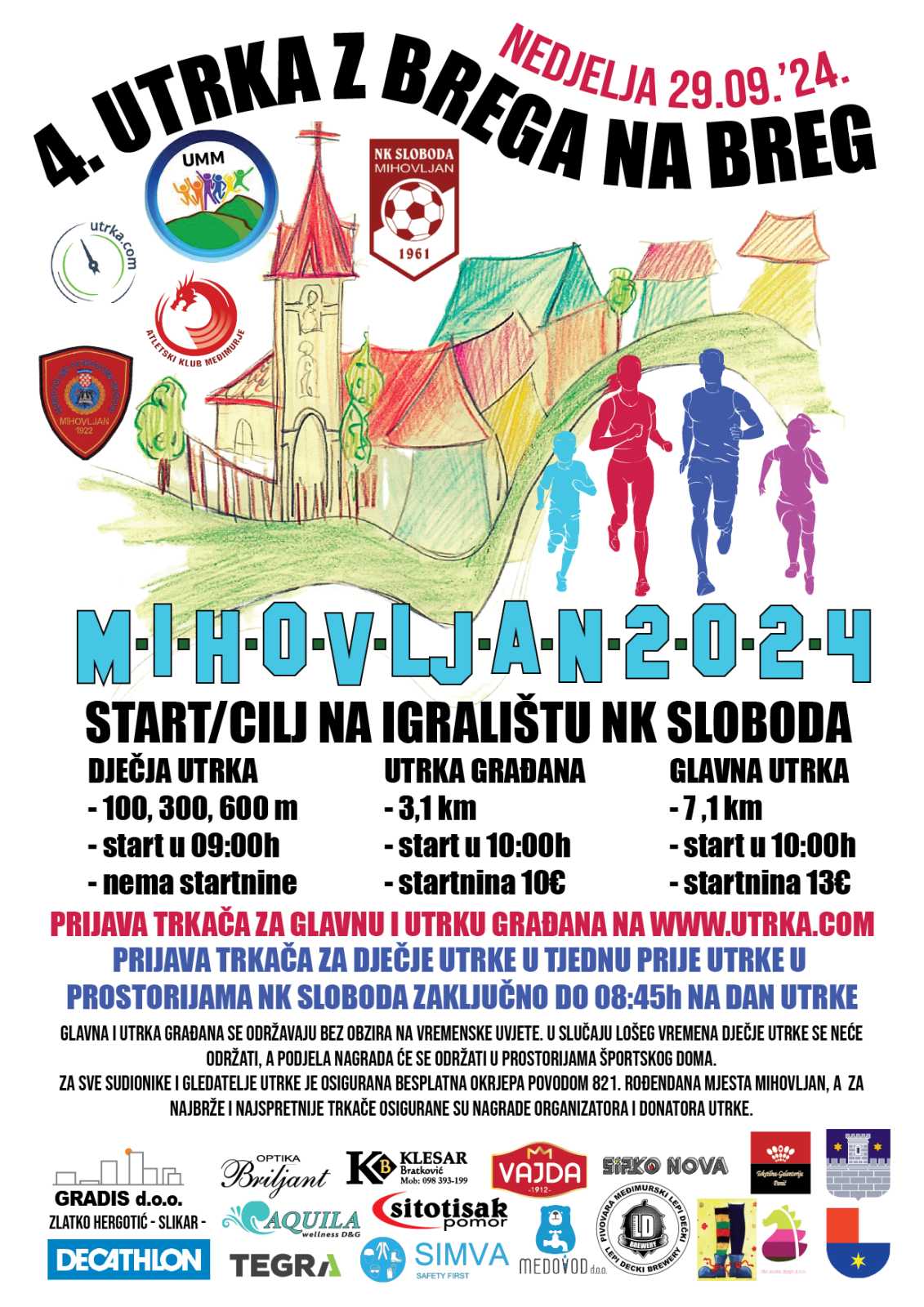 Prijave za utrku traju do 23. rujna. Startnina za dionicu od 3,1 km iznosi 10 €, dok za dionicu od 7,1 km iznosi 13 €. Dječje utrke su besplatne; prijave za dječje utrke moguće su u tjednu prije utrke u prostorijama NK Sloboda i na sam dan do 8:45 sati.