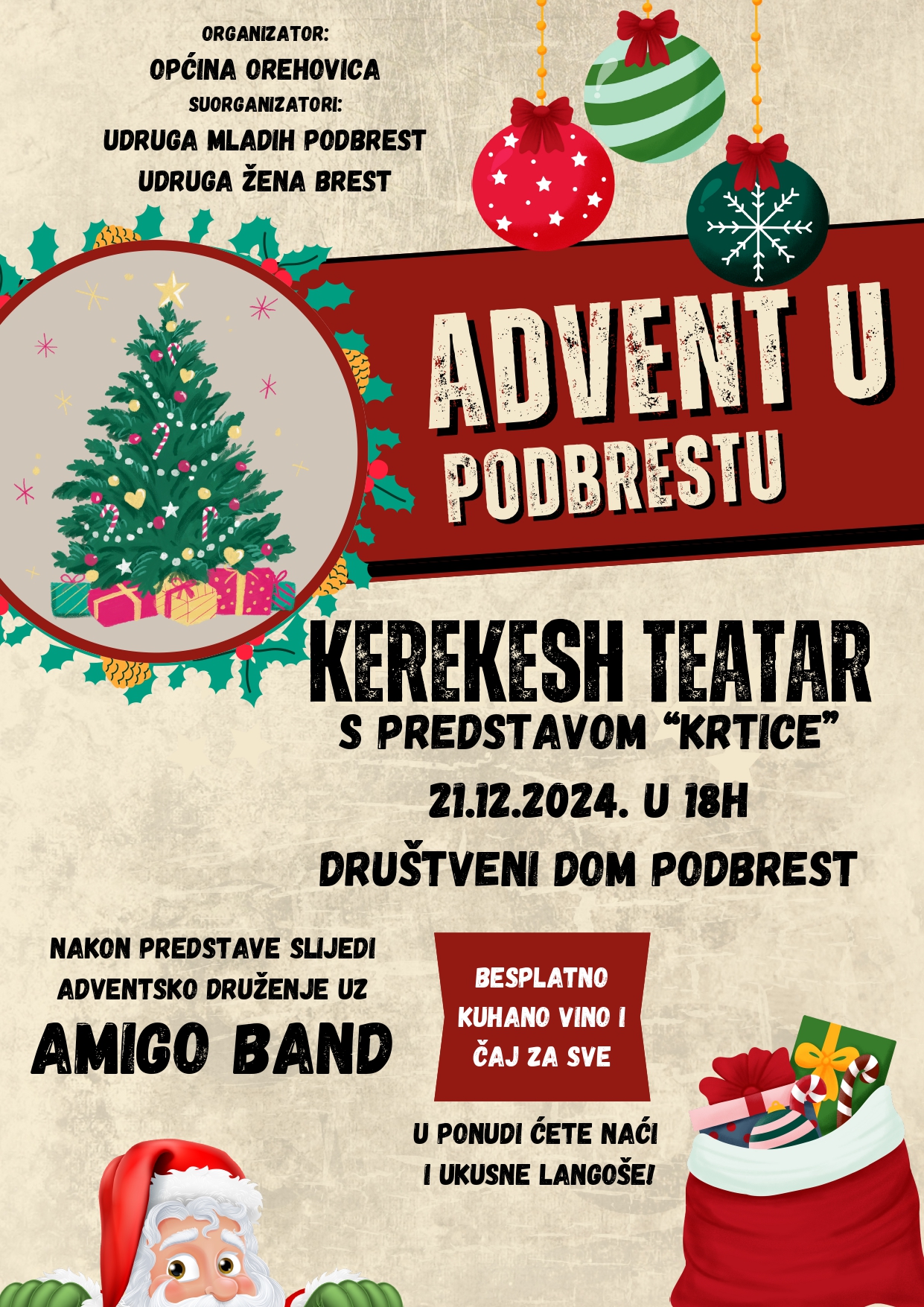 Ove subote (21. prosinca) ispred Društvenog doma u Podbrestu održava se 3. advent u organizaciji Općine Orehovica, Udruge mladih Podbrest i Udruge žena Brest.