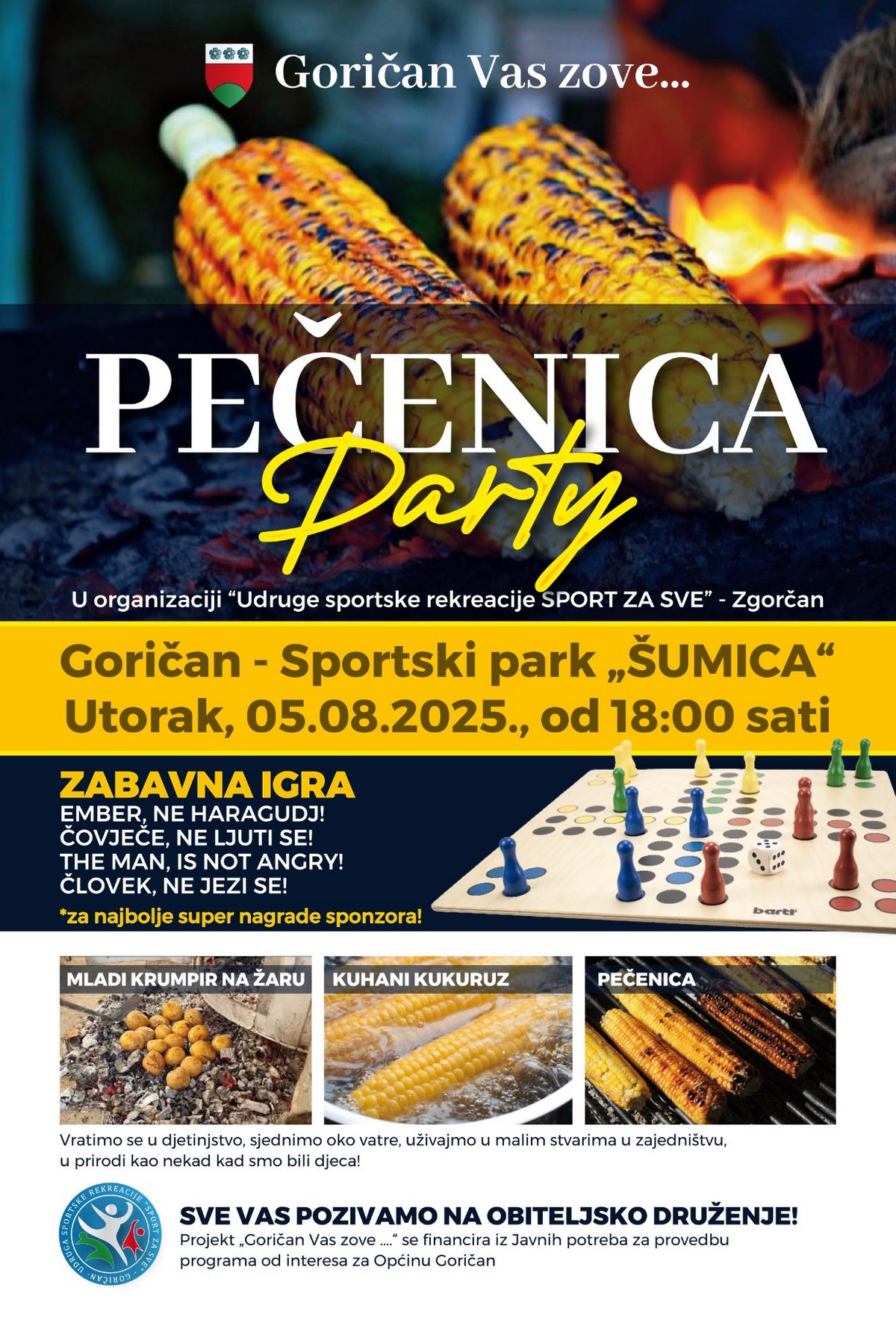 U utorak, 5. kolovoza 2025. godine, na Dan pobjede i domovinske zahvalnosti, u Sportskom parku Šumica na jezeru parka Šuderica u Goričanu, u organizaciji USR Sport za sve Goričan, održat će se „Pečenica party“.