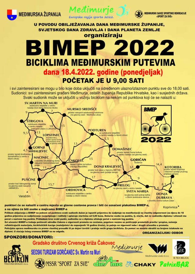 Povodom obilježavanja Dana Međimurske županije, Svjetskog dana zdravlja i Dana planete Zemlje, Međimurska županija, Turistička zajednica Međimurske županije i Međimurski savez, nakon dvije godine korona pauze ponovno organiziraju Sportsko-rekreativnu biciklijadu Biciklima međimurskim putevima – BIMEP 2022. Rekreacija na biciklu uz druženje i dobru atmosferu održat će na Uskrsni ponedjeljak, 18. travnja 2022. godine od 9 do 18 sati.
