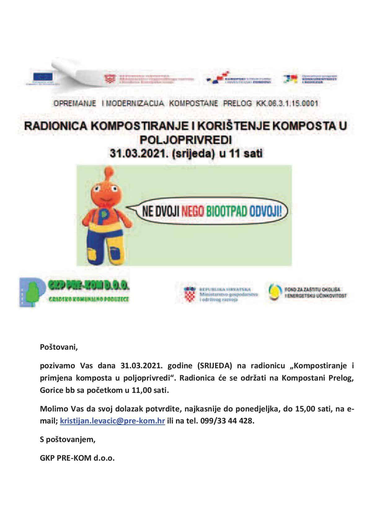 Gradsko komunalno poduzeće Pre – kom d.o.o., u sklopu projekta „Opremanje i modernizacija Kompostane Prelog“ organizira radionicu „Kompostiranje i primjena komposta u poljoprivredi“.