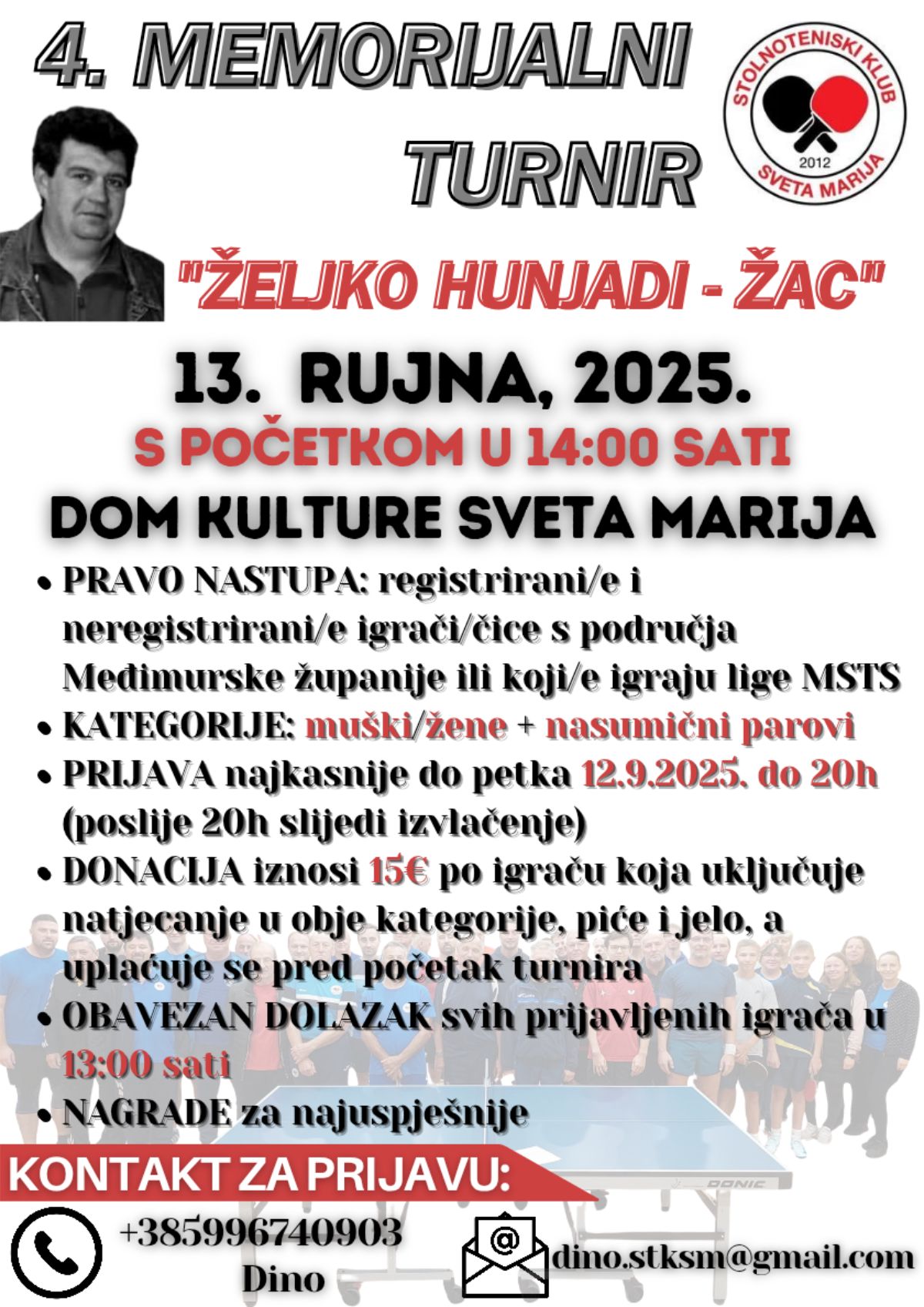 U subotu, 13. rujna 2025., u Domu kulture Sveta Marija održat će se 4. Memorijalni stolnoteniski turnir u spomen na Željka Hunjadija – Žaca. Početak turnira je u 14 sati.