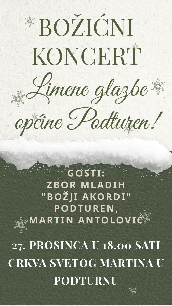 Danas, 27. prosinca, u 18:00 sati, u crkvi Svetog Martina u Podturnu održat će se Božićni koncert Limene glazbe Općine Podturen. Osim glazbenog sastava, gostovat će i Zbor mladih Božji Akordi te Martin Antolović. Ovaj svečani koncert bit će pravo glazbeno iskustvo i savršeno će uljepšati božićno vrijeme.
