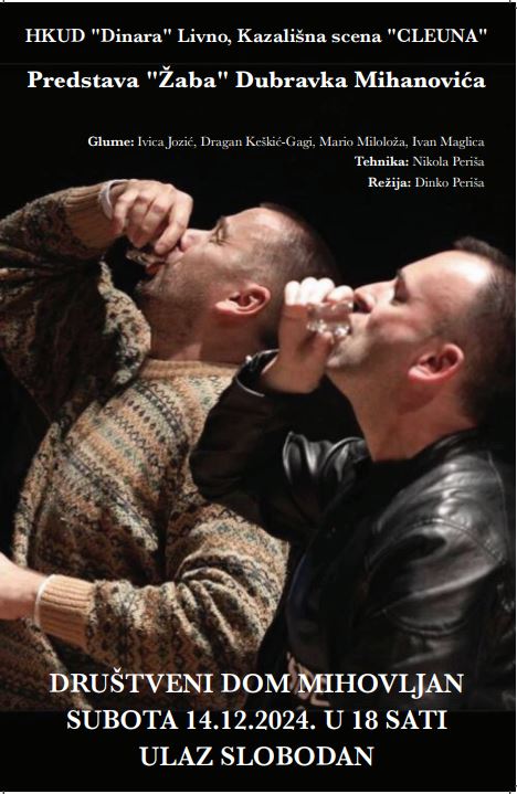 U subotu, 14. prosinca 2024. godine, KUD “Mihovljan” bit će domaćin glumcima Kazališne scene “Cleuna” HKUD “Dinara” iz Livna, koji će u Društvenom domu u Mihovljanu u 18 sati izvesti predstavu “Žaba” Dubravka Mihanovića.