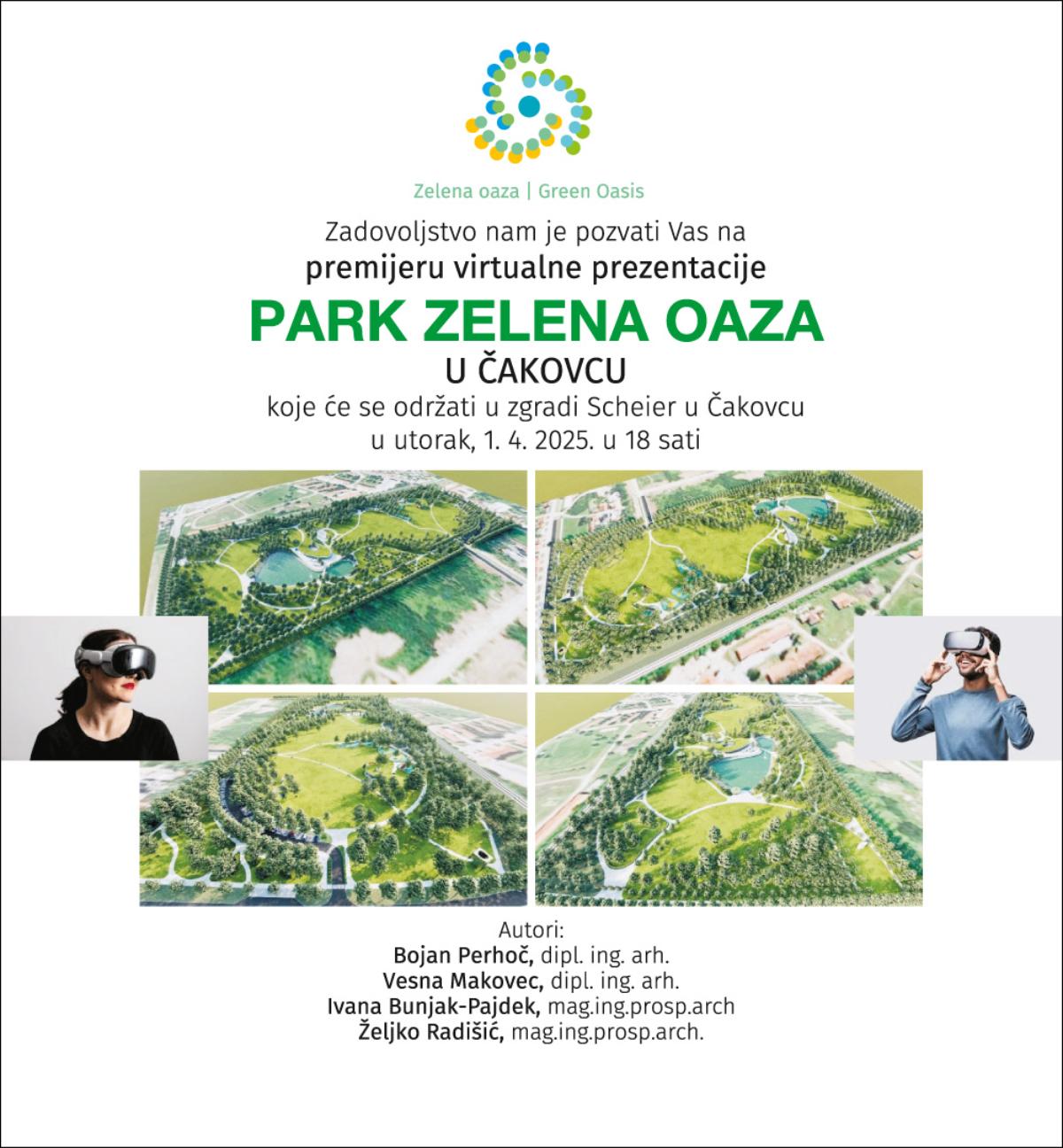 U utorak, 1. travnja 2025., u 18:00 sati u zgradi Scheier u Čakovcu održat će se premijera virtualne prezentacije parka Zelene oaze. Nakon premijere, virtualne prezentacije održavat će se redovito, a termini će biti objavljeni naknadno.