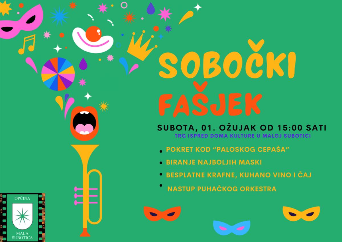 Fašjenska povorka krenuti će u 15 sati iz mjesta Palovec (s Paloskog cepaša -Čakovečka 49, Palovec) uz glazbenu pratnju Puhačkog orkestra Općine Mala Subotica do trga ispred Doma kulture Mala Subotica, gdje će se sve prijavljene maske, prema želji, moći grupno i pojedinačno predstaviti na bini. Slijedi proglašenje pobjednika, dodjela nagrada i priznanja učesnicima, suđenje ”Fašjeku”, te spaljivanje ”Fašjeka”. Nakon spaljivanja „Fašjeka“, druženje uz krafne, kuhano vino i čaj, nastavit će se uz svirku Puhačkog orkestra Općine Mala Subotica.