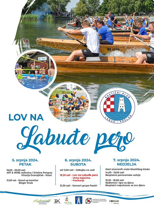 Dvadesetčetvrta tradicionalna manifestacija „Lov na labuđe pero“ u organizaciji Nautičkog kluba Labud, u sklopu koje vas očekuje mnoštvo sadržaja u tri dana na Sportsko-rekreacijskoj zoni Marine Prelog, počinje u petak, 5. srpnja 2024. godine, „Vine art radionicom“ umjetnice Kristine Pongrac i Vinarije Dvanajščak – Kozol od 18 do 20 sati, a nakon toga, u 21 sat, očekuje vas nastup stand up nastup komičara Blogera Krulea!