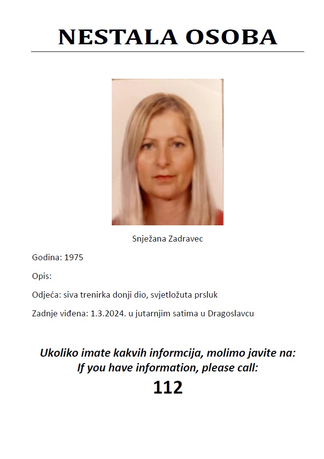 Upravo je u tijeku potražna akcija u mjestu Dragoslavec za nestalom ženskom osobom. Ukoliko imate bilokakvih informacija, javite policiji ili na 112!, objavila je u večernjim satima HGSS Stanica Čakovec.