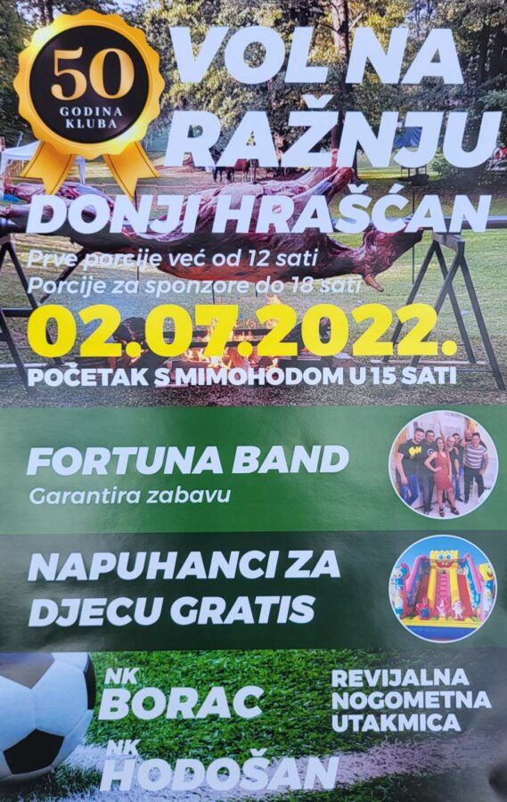 Dobra zabava je zagarantirana jer će se uz jelo – pečeni vol – i piće za atmosferu pobrinuti i Fortuna bend, a neće nedostajati ni zabave za djecu jer su dogovoreni i napuhanci, koji će biti gratis. Organizator ovog događanja je NK Borac Donji Hrašćan uz potporu Općine Donji Kraljevec i ostalih, brojnih sponzora.