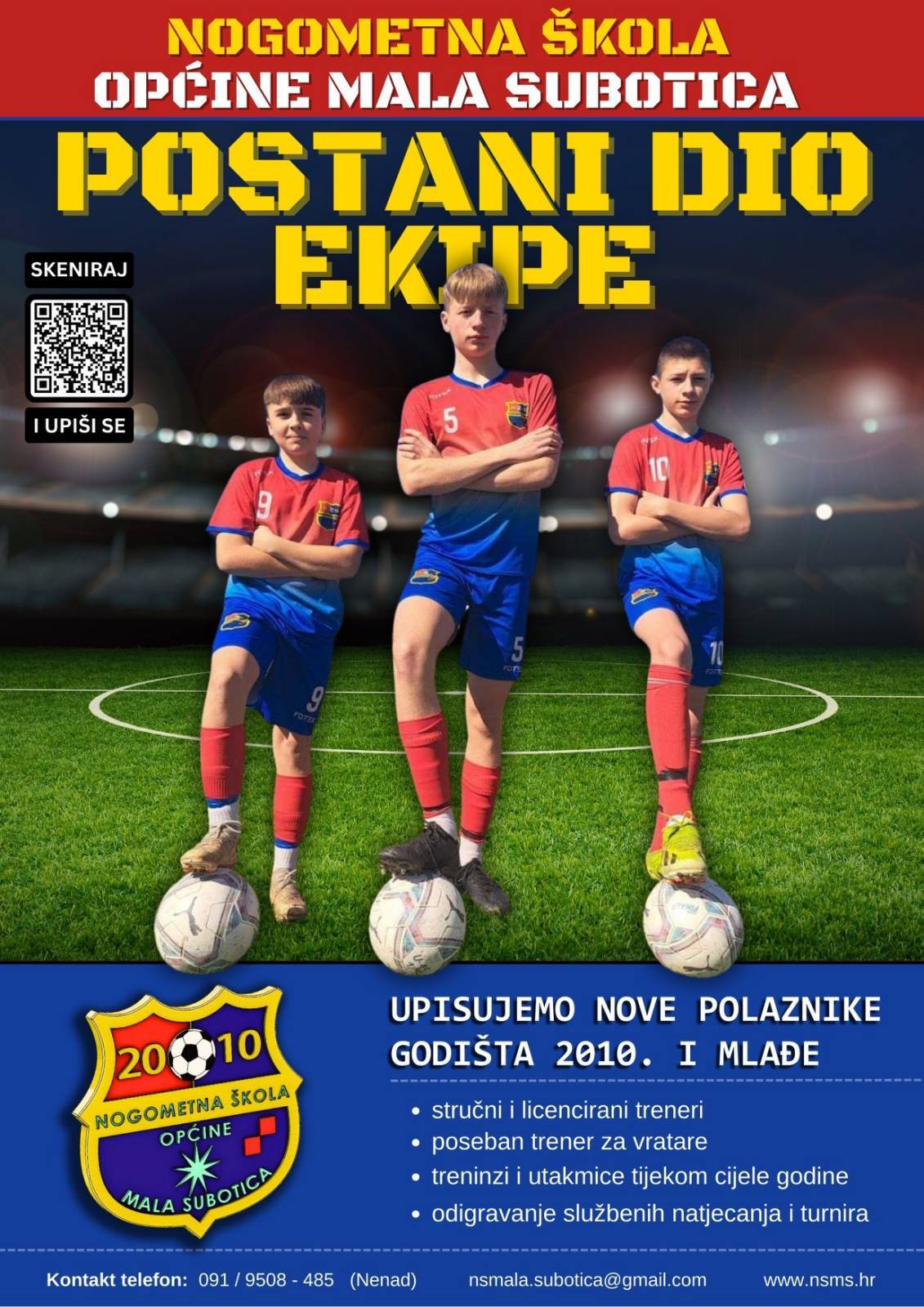 Pozivamo sve zainteresirane djevojčice i dječake već od navršenih 5 godina da nam se pridruže i započnu svoj sportski put kao dio naše velike nogometne obitelji. Upise vršimo tijekom cijele godine, a za sve informacije možete se obratiti na sljedeće kontakt brojeve: