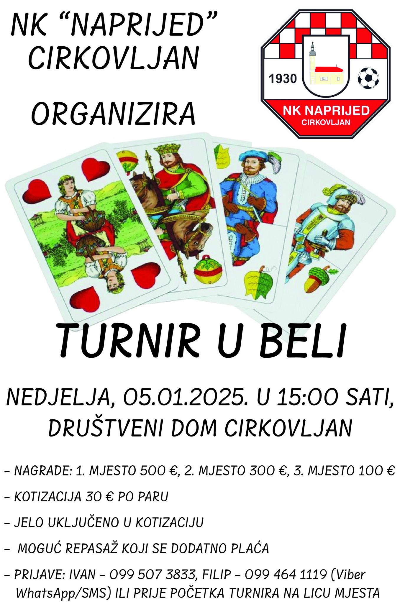 Ove nedjelje, 05.01.2025. Nogometni klub Naprijed iz Cirkovljana organizira turnir u beli.