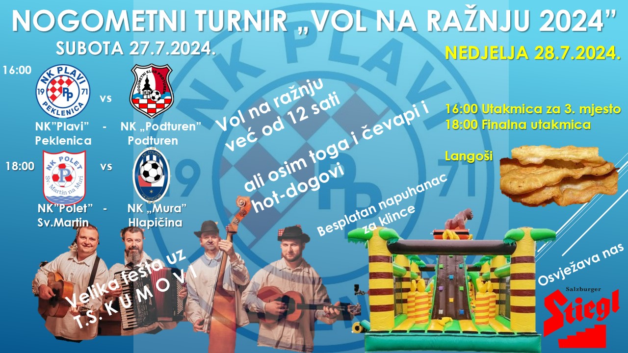 Nogometni klub ‘Plavi’ Peklenica i ove godine organizira tradicionalni nogometni turnir uz pečenog vola na ražnju u subotu i nedjelju 27. i 28. srpnja.