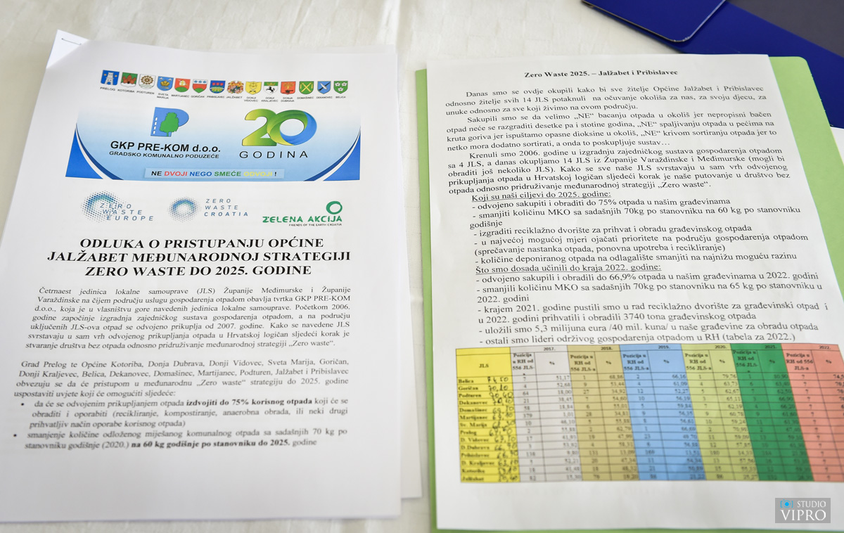 Općine Jalžabet i Pribislavec danas su potpisale ‘zero waste’ strategiju kojom prihavćaju ambiciozne ciljeve smanjenja, ponovne uporabe, odvojenog prikupljanja i recikliranja otpada. Time su ušle u društvo 14 općina u sastavu komunalnog poduzeća PRE-KOM koje su, prateći preporuke Zelene akcije, postale lider u održivom gospodarenju otpadom u RH te primjer dobre prakse u EU.