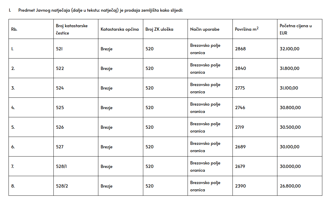 Početne kupoprodajne cijene za zemljišta upisane su u tablici uz česticu nekretnine.