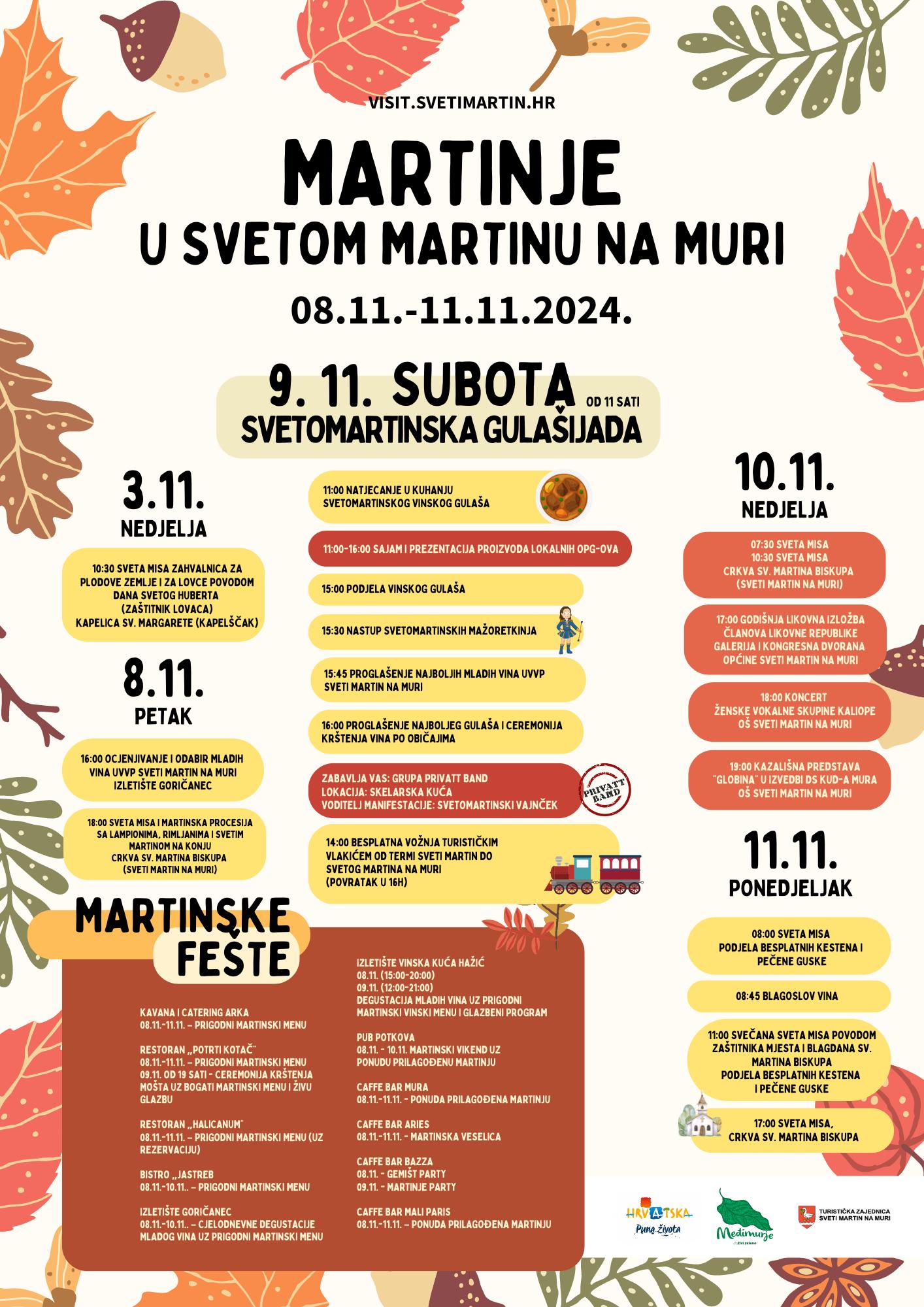 Sveti Martin na Muri, poznat po svojoj bogatoj kulturnoj baštini, priprema vam nezaboravne dane ispunjene smijehom, pjesmom i običajima krštenja mošta. Dođite i osjetite čaroliju Martinja, gdje se mještani i posjetitelji zajedno okupljaju kako bi proslavili zaštitnika vinara, Sv. Martina.