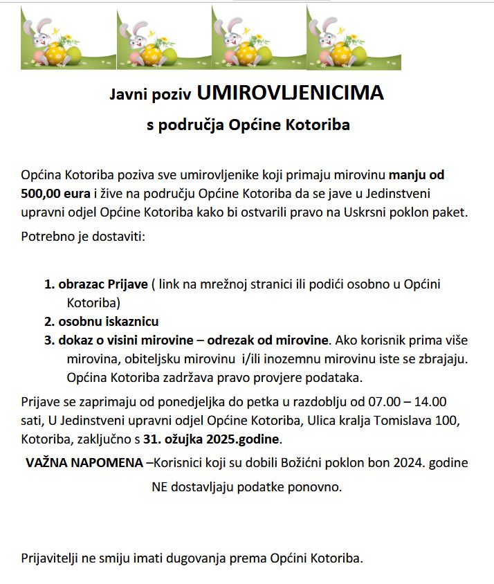 Povodom Uskrsa, i Općina Kotoriba pokazuje da misli na svoje starije mještane te poziva sve umirovljenike s područja općine koji primaju mirovinu manju od 500 eura da se jave u općinu kako bi ostvarili pravo na „Uskrsni poklon paket“ – poklon bon za trgovinu u iznosu od 50 eura.
